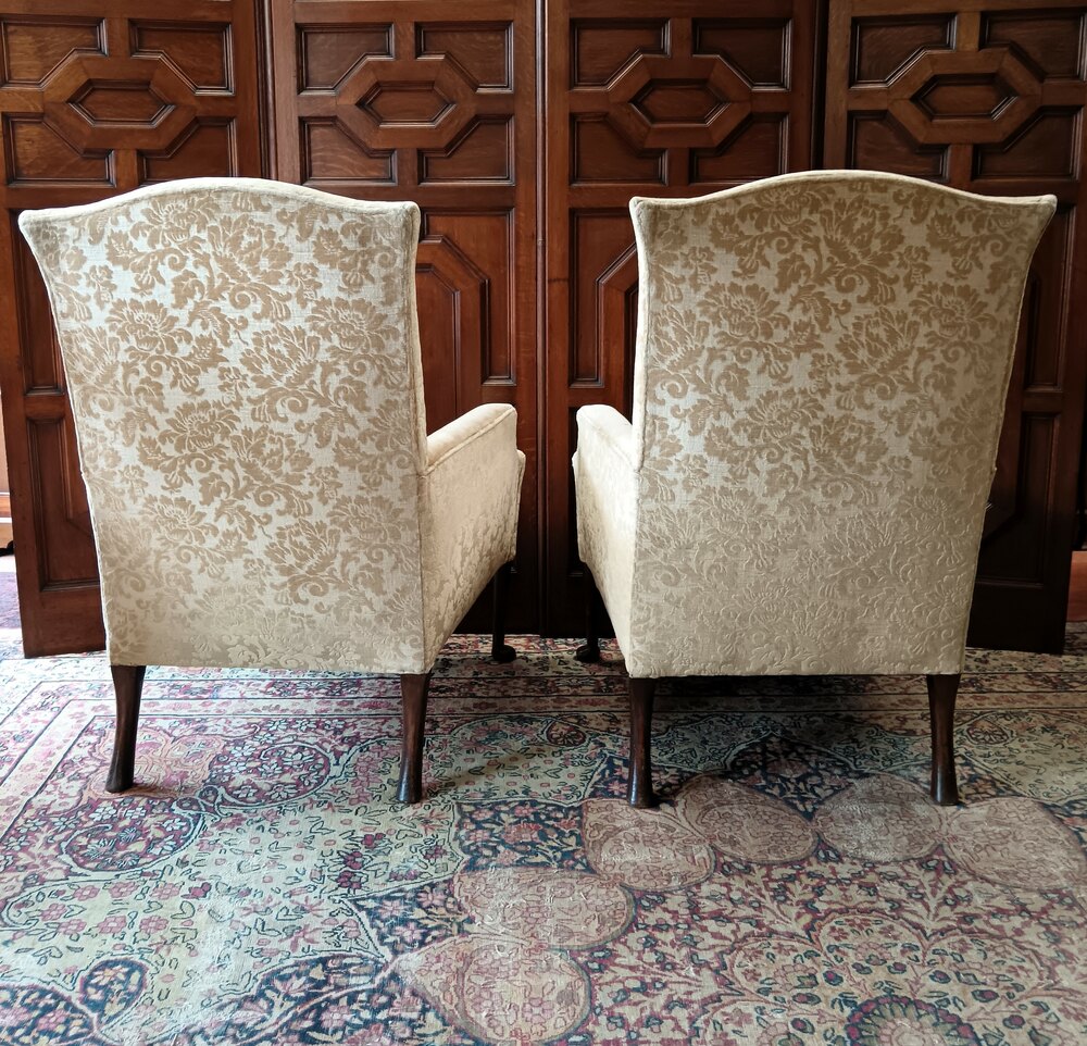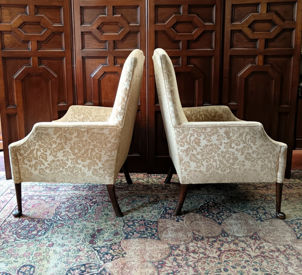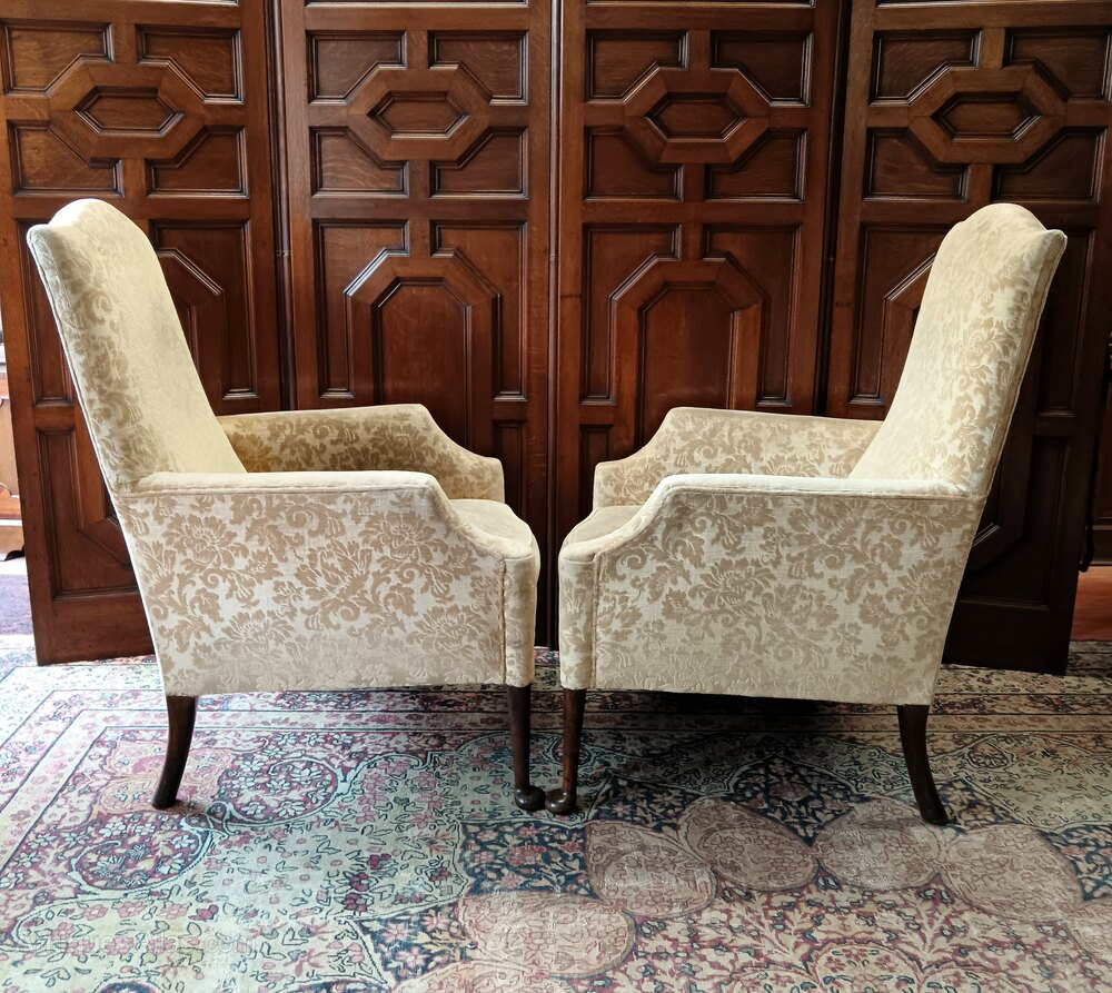 Raised on mahogany turned straight legs with pad feet to the front and slight cabriole legs to the back, both the arms and the back have a delicate curved shape which add to the look of these rare and thoroughly enjoyable antique lounge chairs.