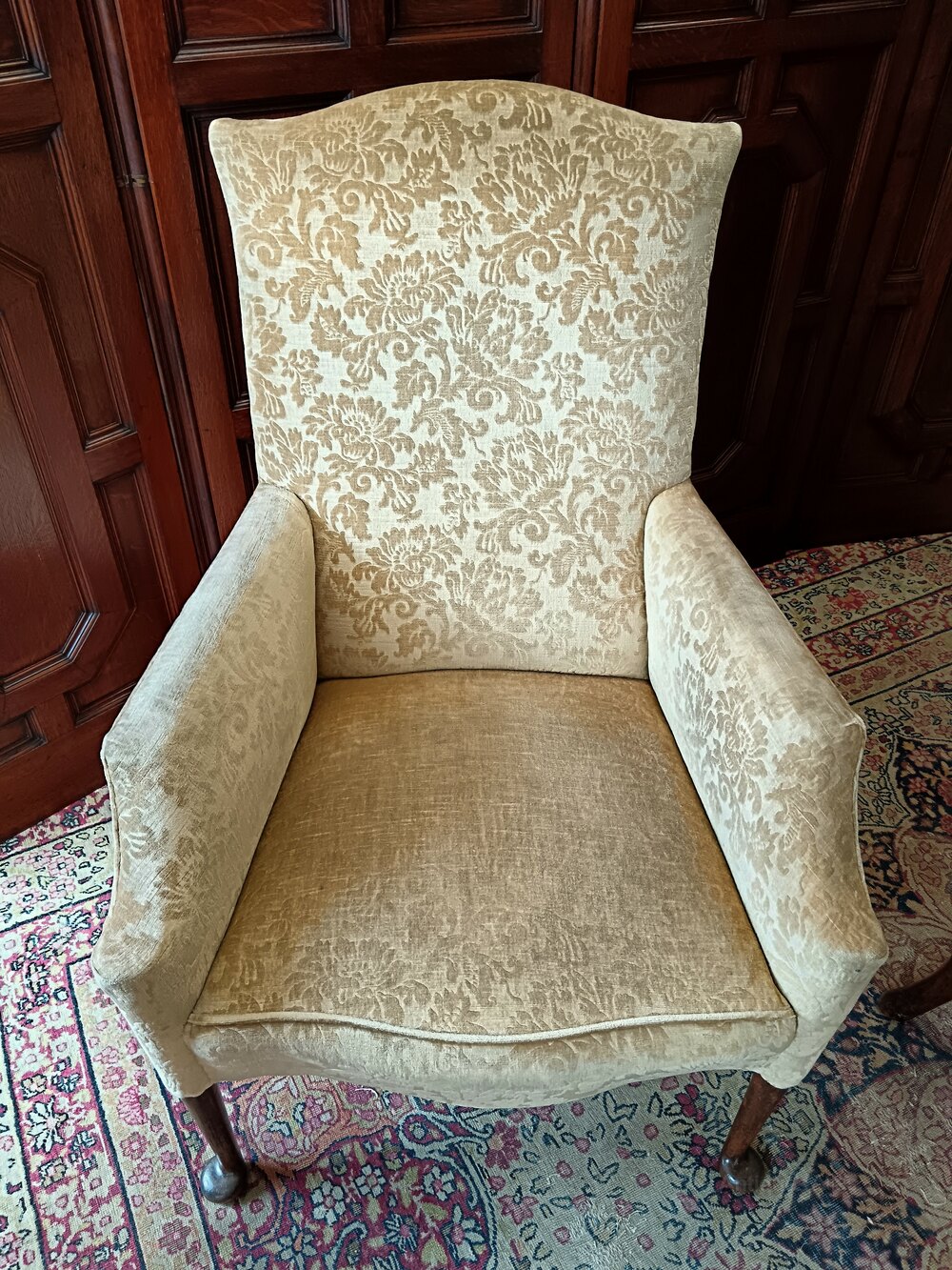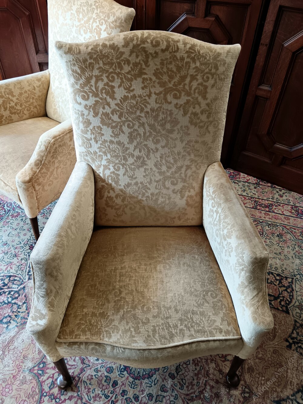 Pair of late 19th century /early 1900's elegant library or fireside armchairs of unique design.Upholstered with the originally light gold velvet damask, their colour has slightly faded showing evidence of a constant considerate use which is a specific charm of these comfortable chairs.