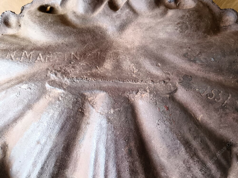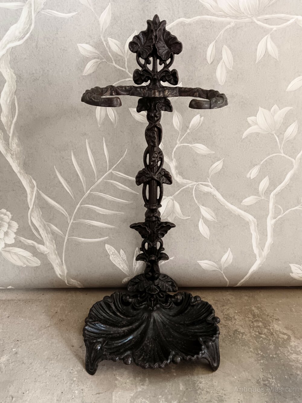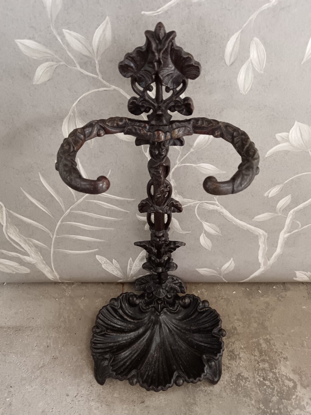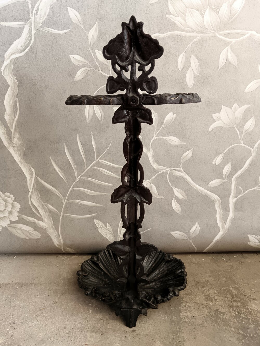 Antique Belgian cast iron umbrella / stick stand or fireplace stand.The scallop shell base is quite unique for this type of iconic Belgian Liberty Hall or Fireplace Stand.
