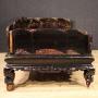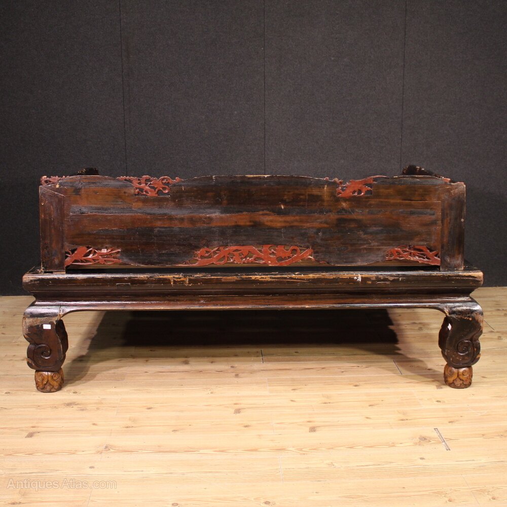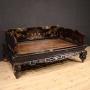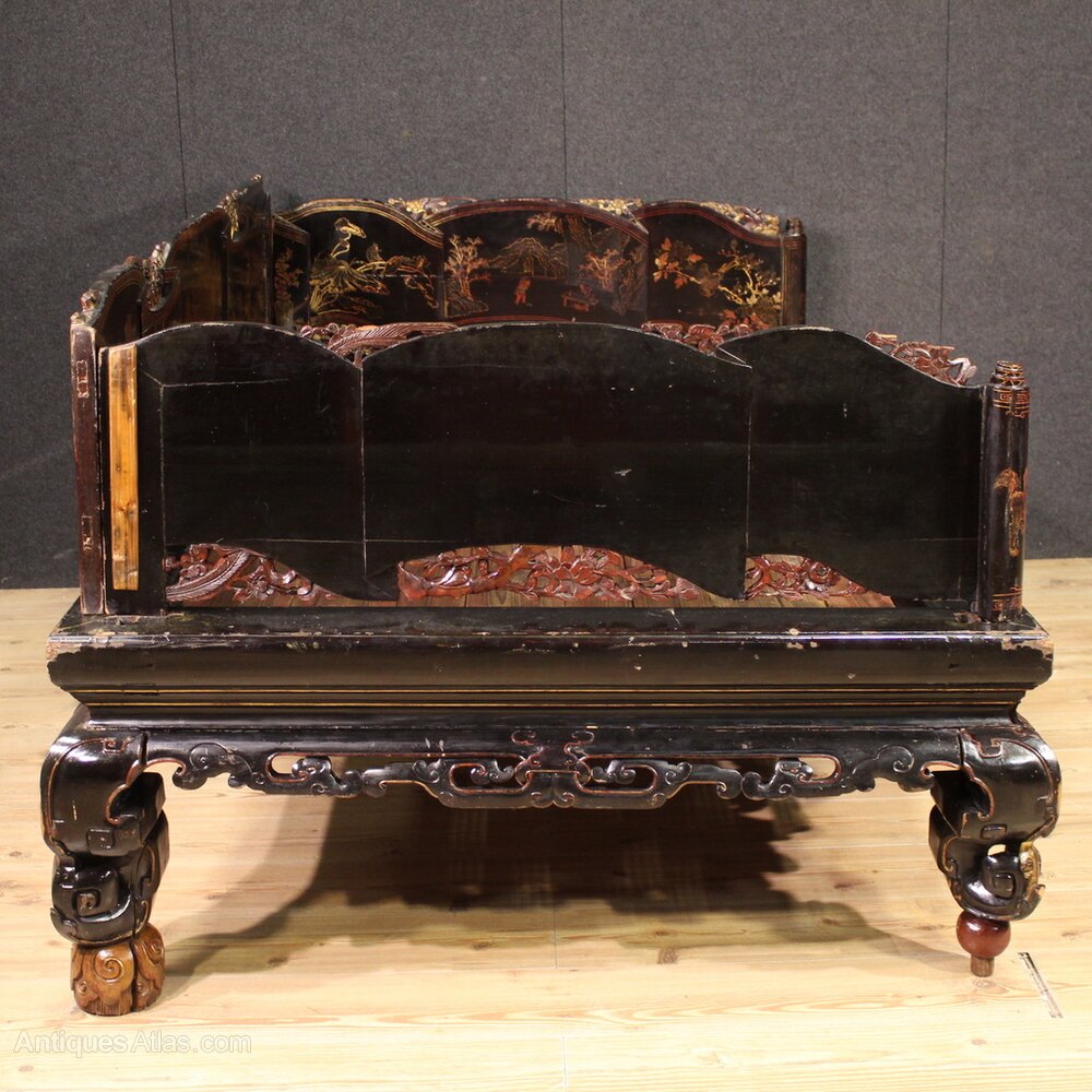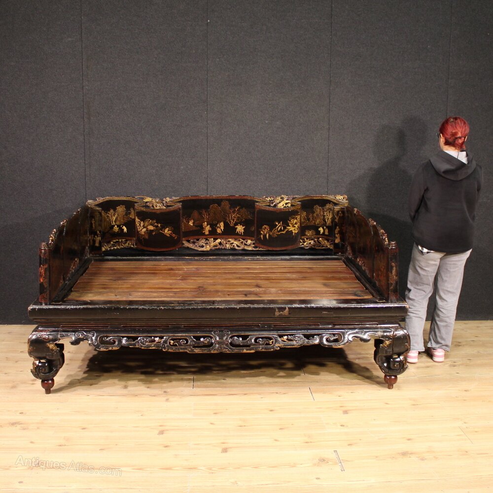 Great Chinese opium bed from the late 19th century. Finely carved, lacquered, gilded, and hand-painted exotic wood, this bed is of excellent quality and visually striking. The sofa base is constructed from a single block and cannot be dismantled. The headboard and side panels are adorned with painted flowers and landscapes with characters in antique Oriental style (see photo).The sofa rests on four solid, richly carved and gilded legs, with rear feet featuring carved spheres. This bed is ideal for a large living room or for display outside under a protected porch, for antique dealers and interior decorators. It has a beautiful patina and is structurally sound, with minor signs of age (see photo). Overall, it is in good condition.