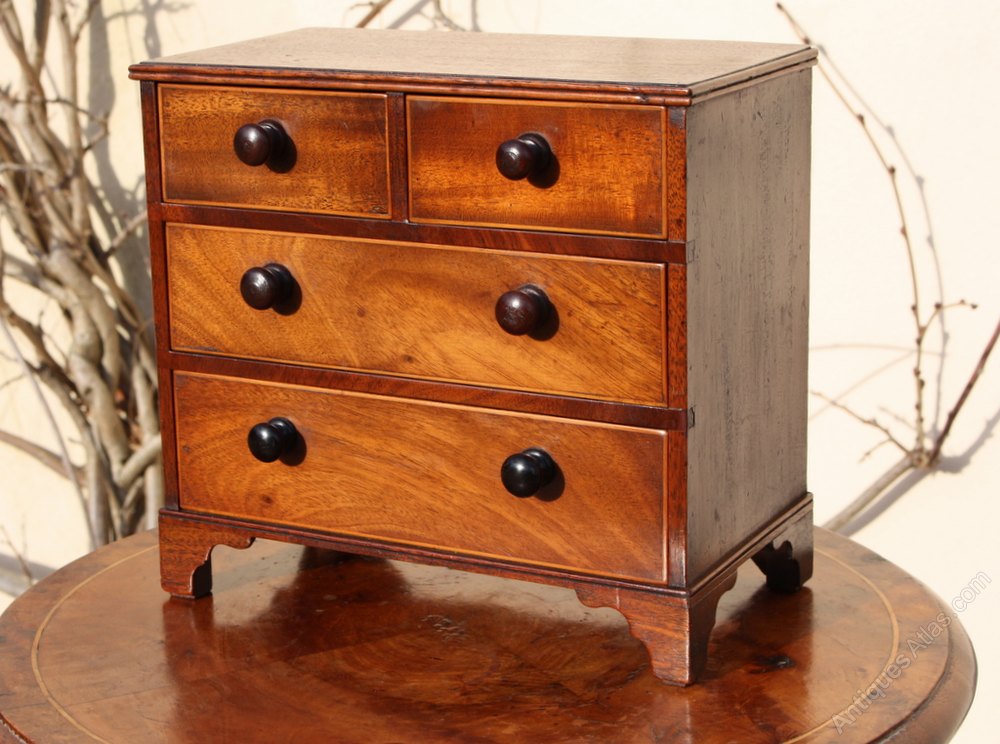 pretty mahogany veneered miniature chest with 2 short over 2 long drawers decorated with boxwood stringing.Good waxed finish.29cm wide 16cm deep 27cm tall