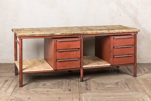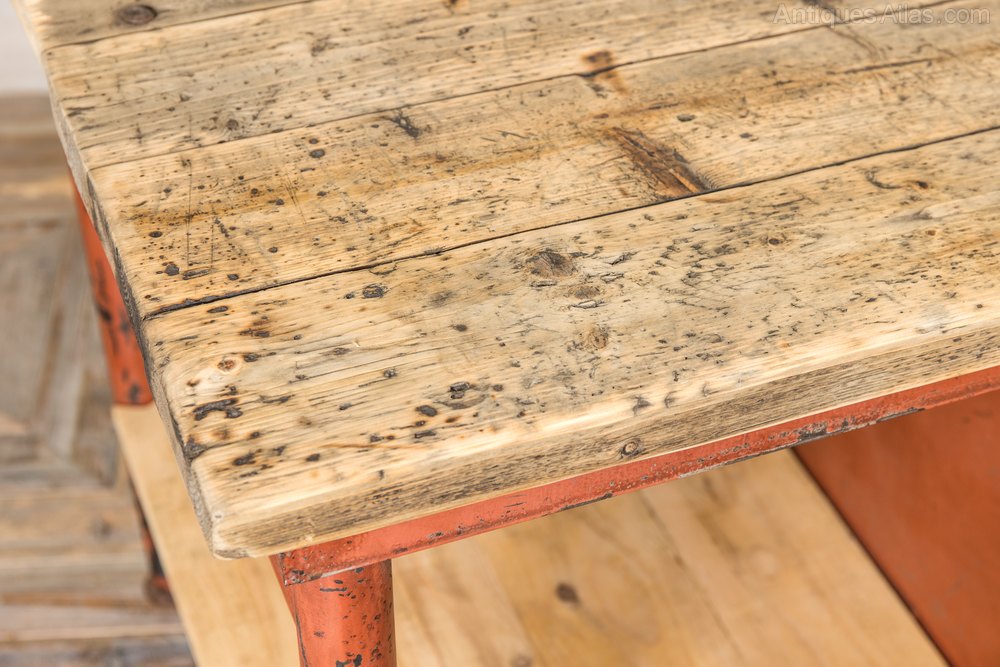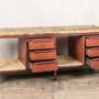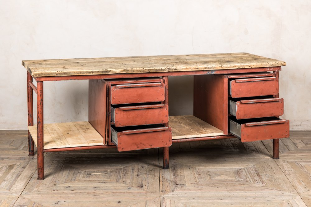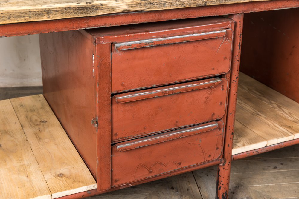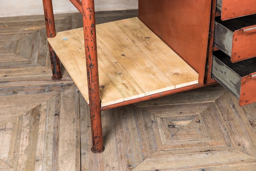 Our Industrial Metal Sideboard with Wooden Top has tons of industrial character, including a red/orange distressed paint finish, a raw, natural wooden top and shelves and drawers for storage.Hard wearing and robust, the sideboard works for an industrial inspired bar or restaurant, it can be used to store cutlery, napkins, and glassware, but looks the part, too!