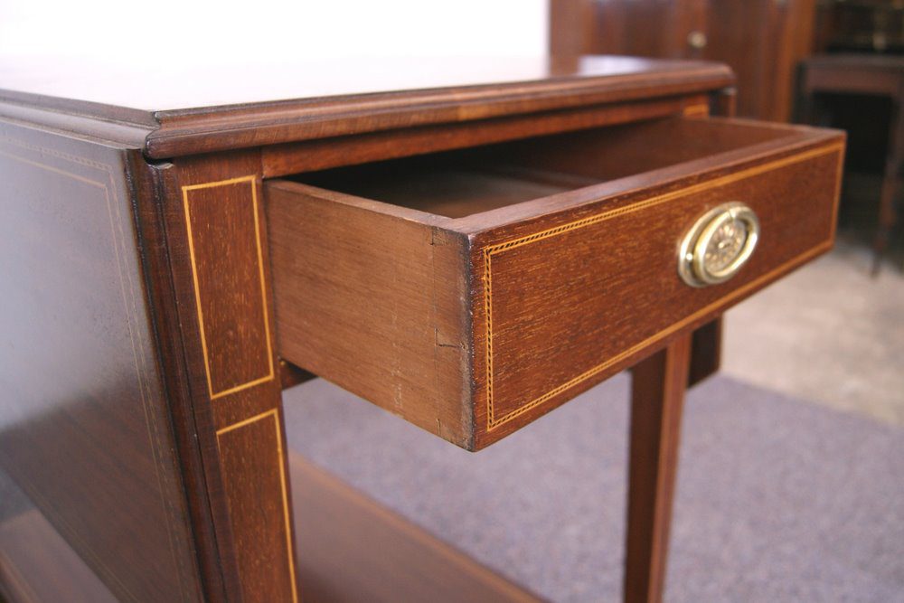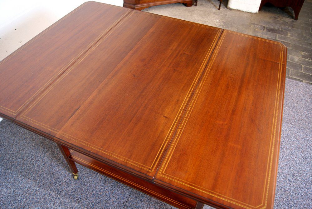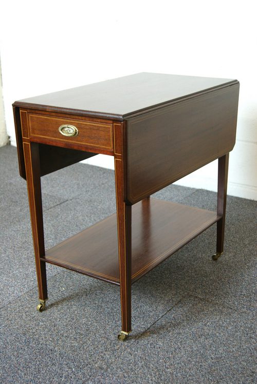 Pretty mahogany Pembroke table, having a swivel top, chequer banding, boxwood line inlay, a single drawer to one end, and raised on square tapering legs with original brass castors, the legs united by an under tier.Date1910s :