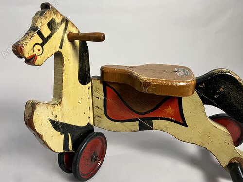 Early 20th century child's ride-on toy horse. Made in Oshkosh, Wisconsin, USA, by the company Gould MFG.Co, this little "Horsie Toddler" is an eternal childs delight.Made from local wood, it has its original paintwork and rubber wheels. The head and front feet are hinged to change direction. Overall, the condition is excellent for its age, but it has had a few falls, one resulting in a break on the body, which has been well mended. Circa 1920s