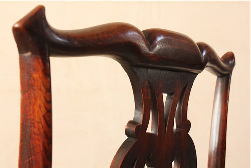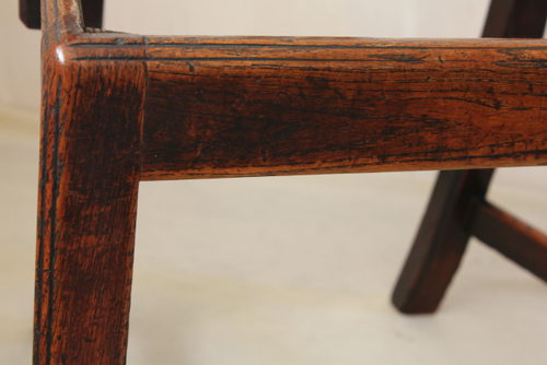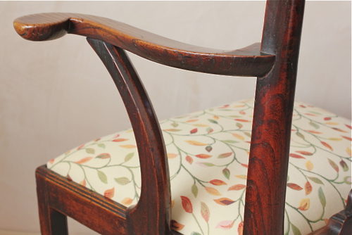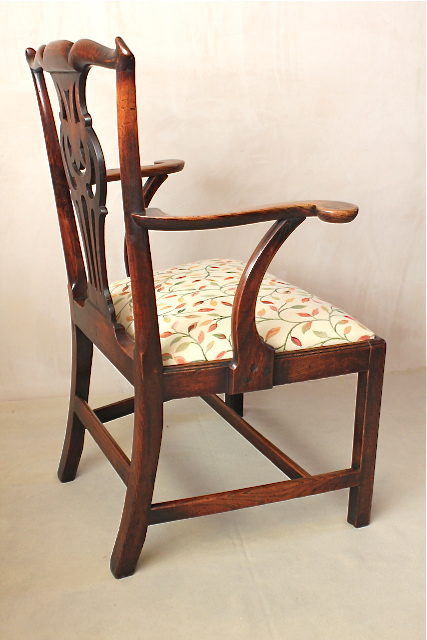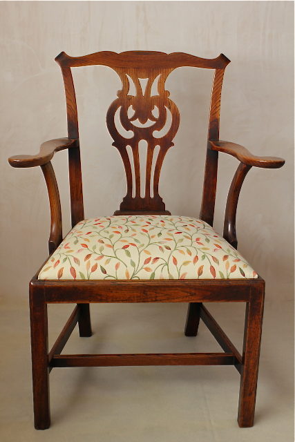 A good late 18th century country open armchair in the Chippendale style. Made in elm, it has the distinctive figuring and warm colour of the wood. The carving of the arms, top rail and back splat is executed with skill and flair. The seat rails and chamfered front legs are finished with carved line moulding, nicely softened with age. The drop-in seat has been re-upholstered. The chair is a fine example of its period, and in superb original condition.DateLate 18th Century :