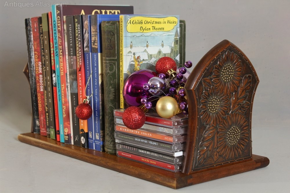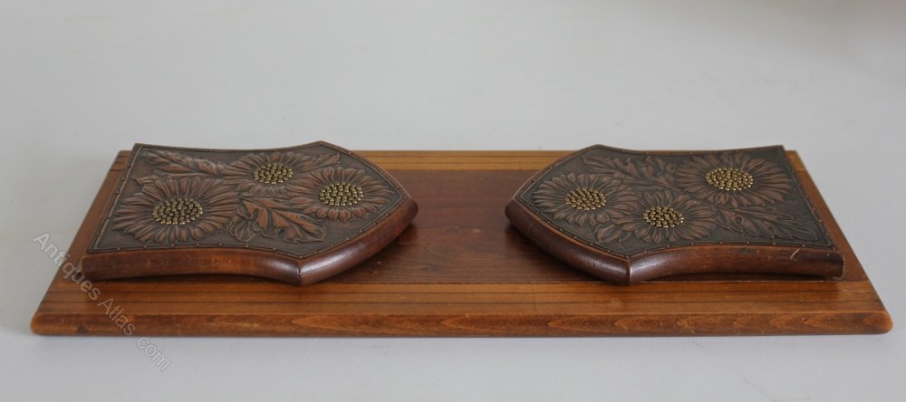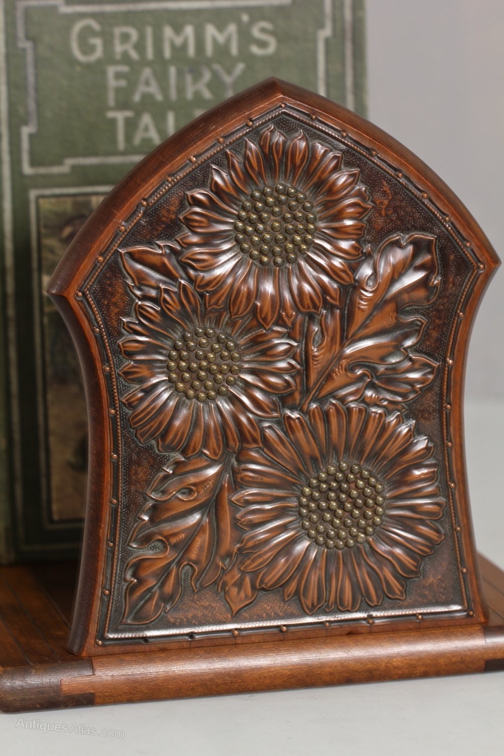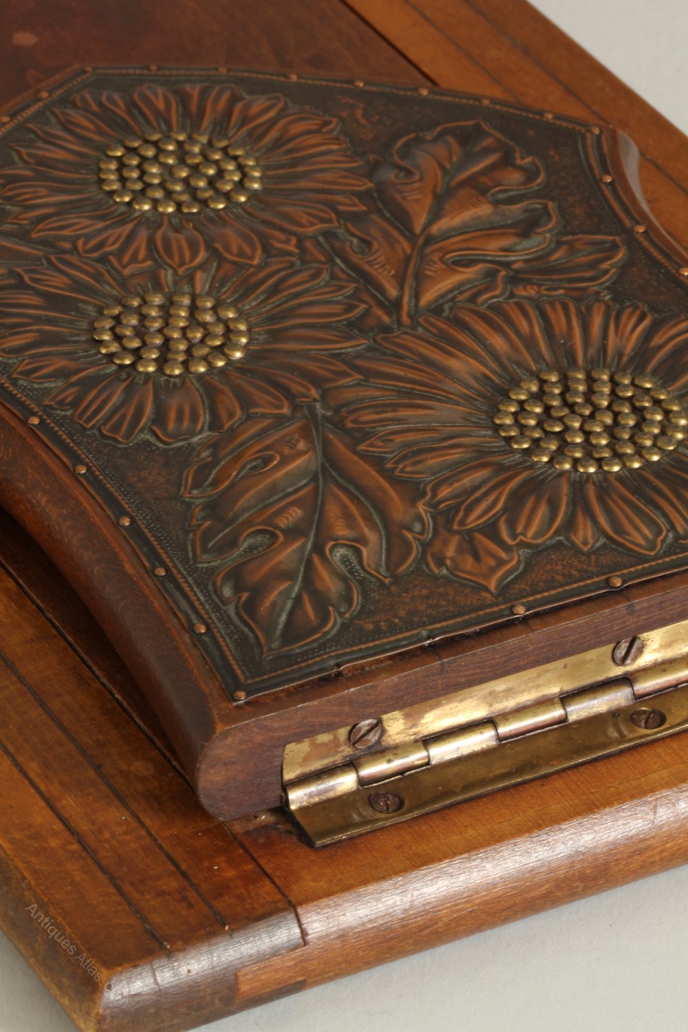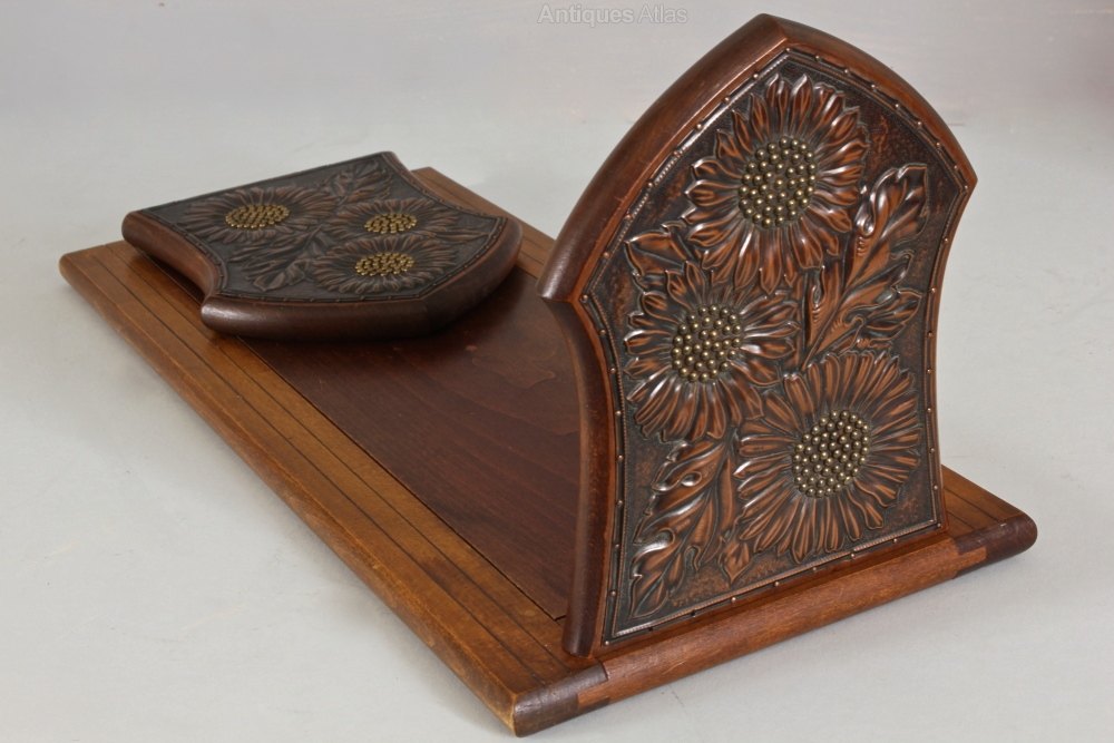 An early 20th century wooden expanding Book Rest. The folding ends are decorated in a late Art Nouveau manner, with panels of pressed copper in a sunflower design. Brass nail heads form the centre of the flowers. The base has fine copper stringing inlaid into the wood. Continental, probably French. Circa 1920.Width: 41cm (16")