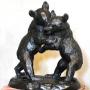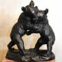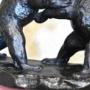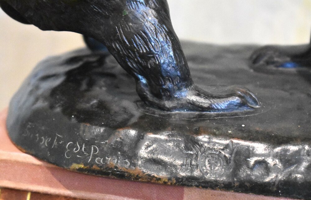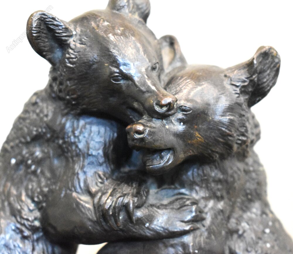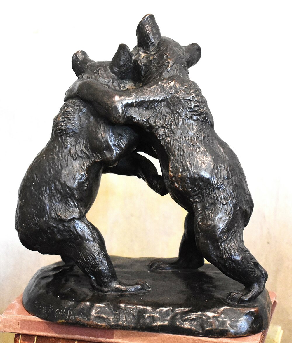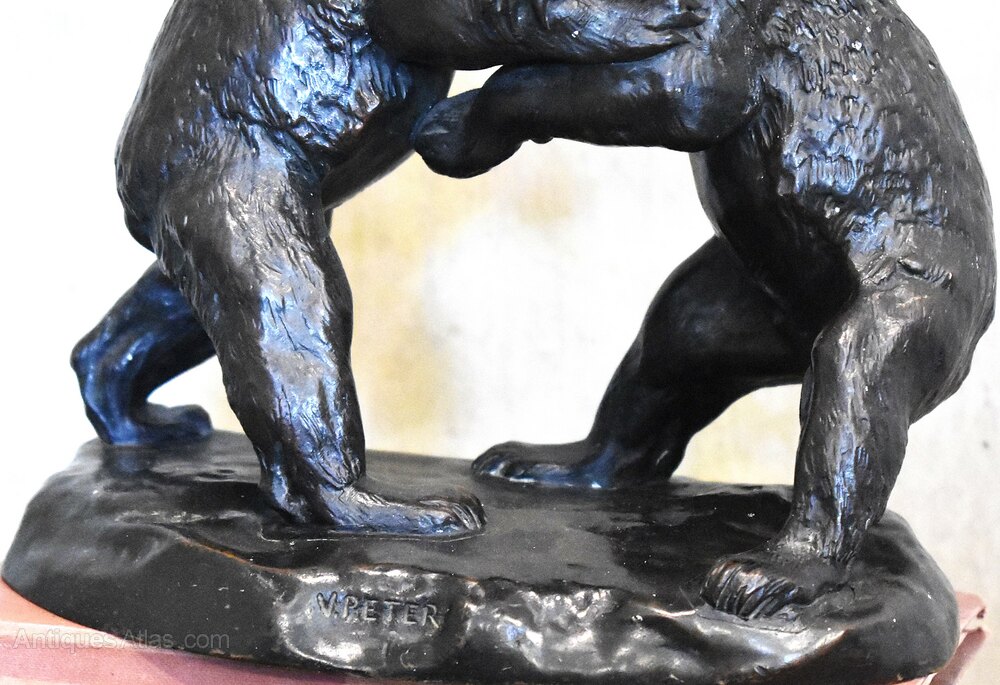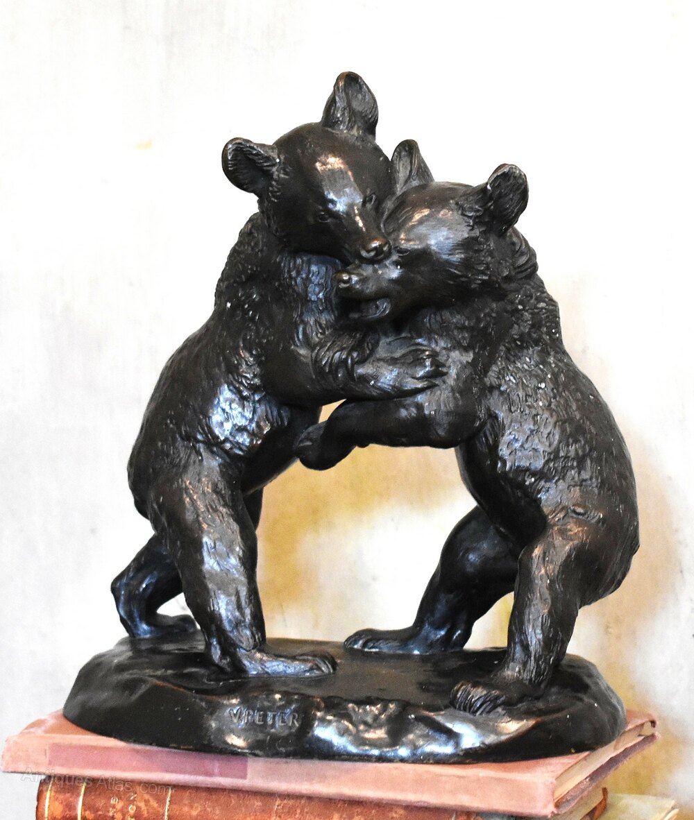 A fine bronze depicting two bear cubs fighting by the sculptor Victor Peter 1840-1918. The work beautifully shows the two bear cubs play fighting, with them both on their hind legs and one biting the others muzzle. The work is signed to the front ‘V Peter’. Victor Peter 1840-1918 was taught by Vital-Cornu and Devaulx, and was a prolific and accomplished sculptor, painter, and medallist, exhibiting busts and medallions at the Paris Salon in 1868. He then went on to exhibit animalier bronzes and bas-reliefs from 1873 onwards. Peter exhibited at the Beaux-Arts in 1891 and the Exposition Universelle of 1900. He was honoured with a number of first and second-class medals at the Exposition of 1889 and 1900 and was also awarded the Legion d'Honneur in 1900. His work can be seen at Angers and Caen museums and his output included over one hundred bronzes, plaques, and medallions. Victor Peter was also much in demand as a finisher of other sculptors' marbles, including the work of Rodin, as well as being a proficient direct carver (he was asked by Rodin to carve his most important marble sculpture, Christ and Mary Magdalene in 1908). A medallion of Rodin was among those that Peter showed at the Exposition Universelle of 1900. This bronze is also marked with a Susse Freres signature and pastille mark and the letter M to the back of the base. Susse Freres was the premier bronze foundry in Paris. The bronze is in very good untouched condition just the odd mark and visible join where the bronze figures are fixed to the base. The whole is an attractive and desirable animalier bronze. C.1900.Overall sizes in inches: