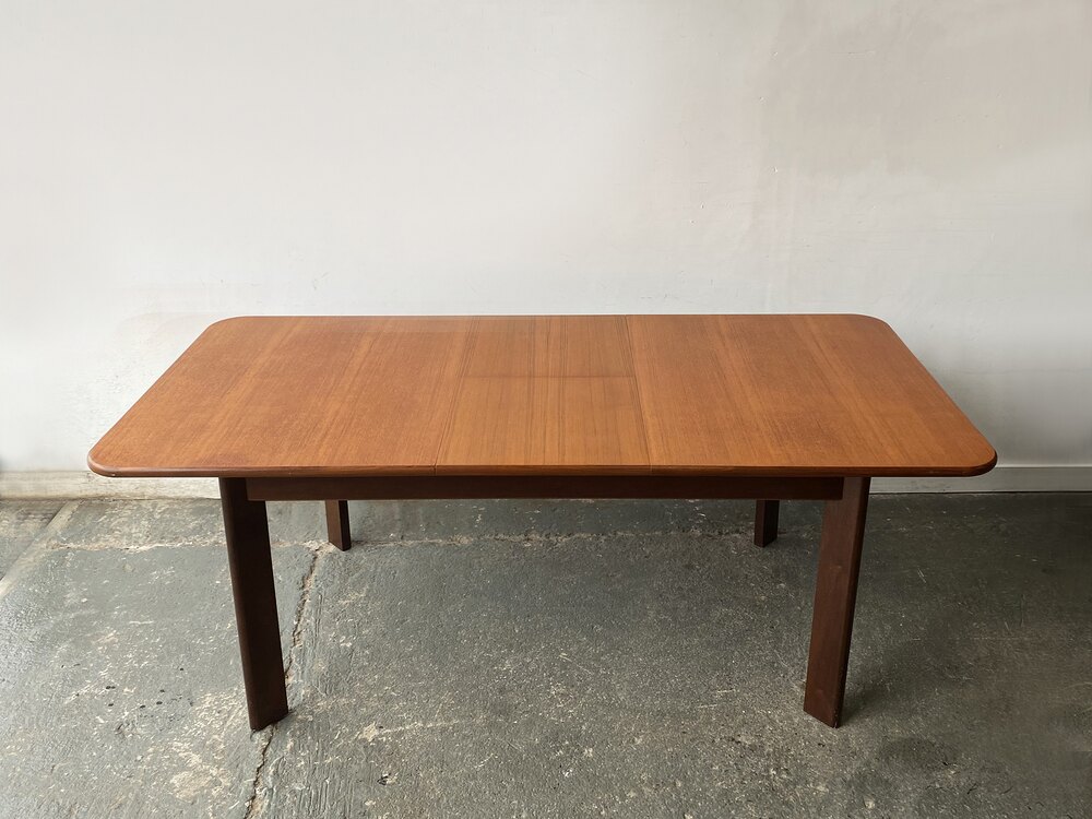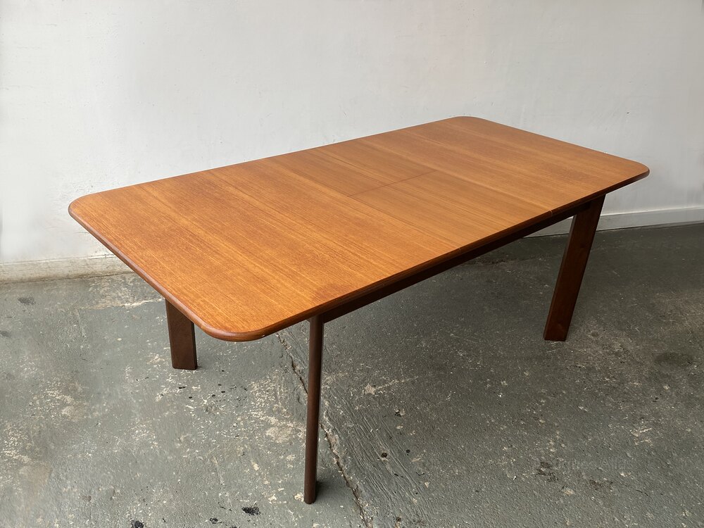 This Mid-Century modern G Plan extending dining table stands out with a design that diverges from the brand’s more recognisable styles. Likely produced during the era of G Plan’s collaboration with Danish designers such as Ib Kofod-Larsen, this piece carries a definite Scandinavian influence in its clean lines and understatement.It features a solid, substantial top with softly rounded edges. Its most distinctive feature is the set of wide, splayed legs – an unusual design detail for G Plan.