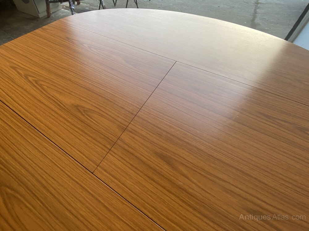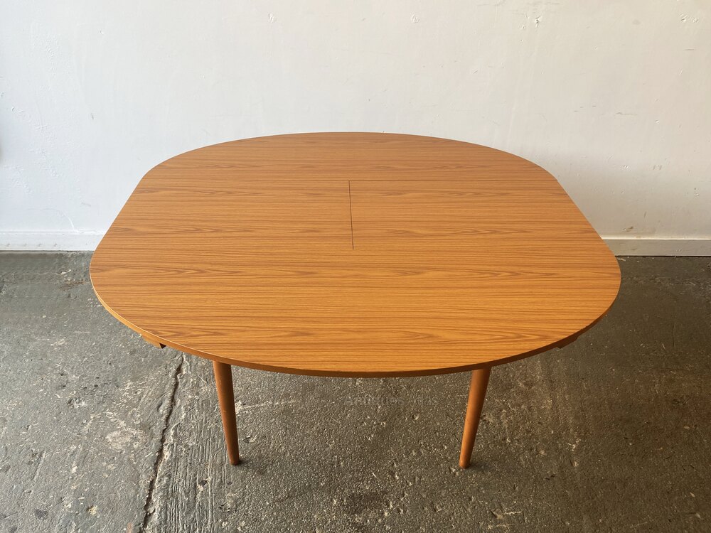 Founded in 1957 by Chaim Schreiber, Schreiber furniture is an great British success story. The Company was one of the biggest names in furniture in the 1970s, rivalling manufacturers like G Plan. At one stage they had 280 Schreiber Furniture Centre shops throughout UK.This Schreiber extending dining table is typical of the Schreiber style. Wood grain Formica laminate table top with solid beech tapering legs.