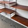 The system features teak veneer shelves and a desk unit supported by slim grey metal ladder-style uprights.