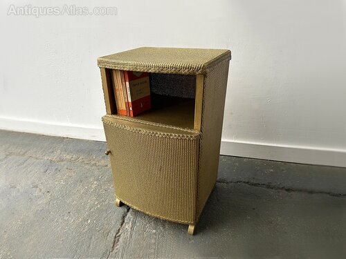 This is a mid-20th century compact curved front woven bedside cabinet, also suited for use as a bedside table, lamp table or small storage cabinet. This piece is similar to traditional Lloyd Loom furniture.It has a fully woven exterior (in either rattan or wicker) and is finished in a warm gold/brass tone.
