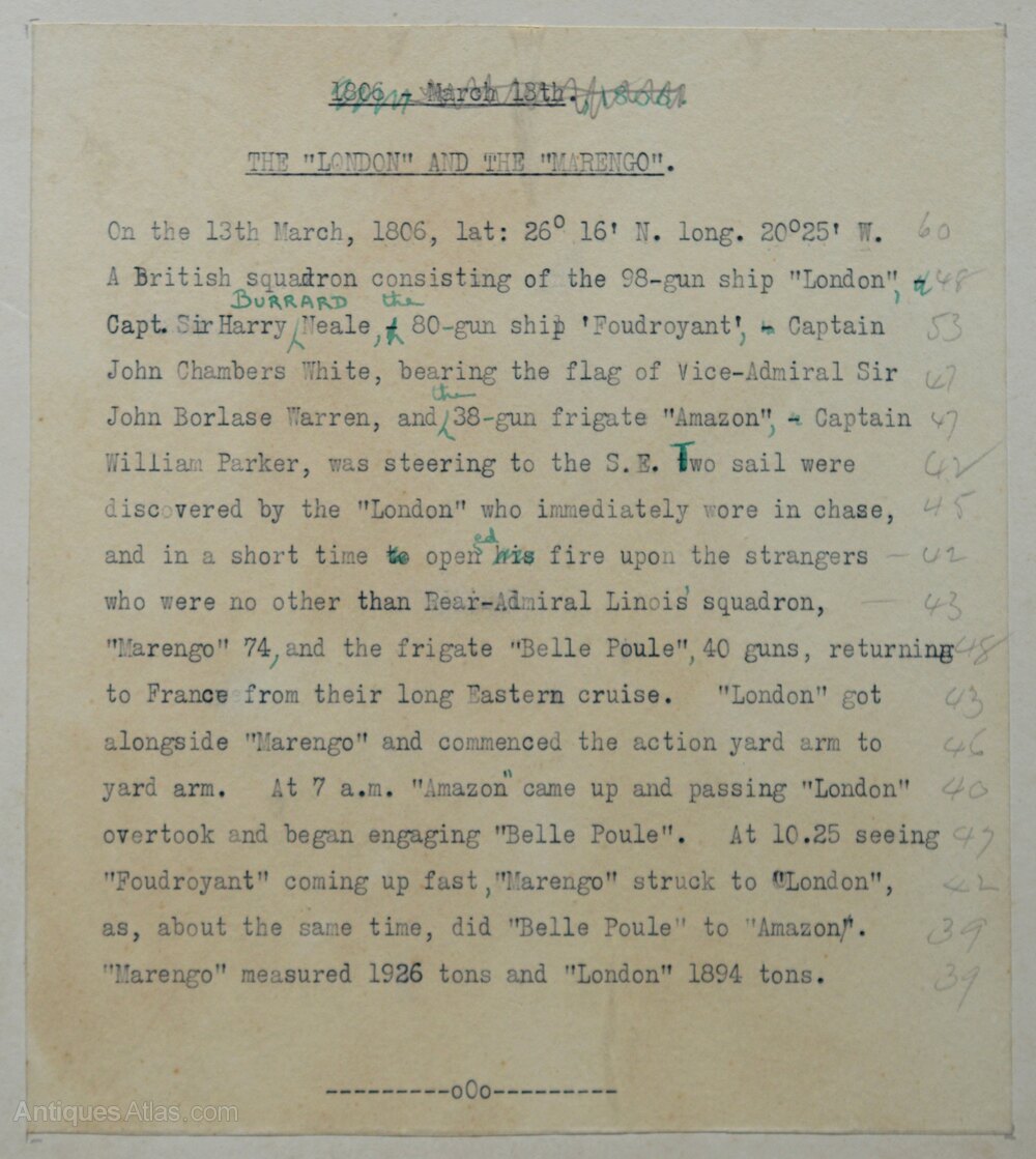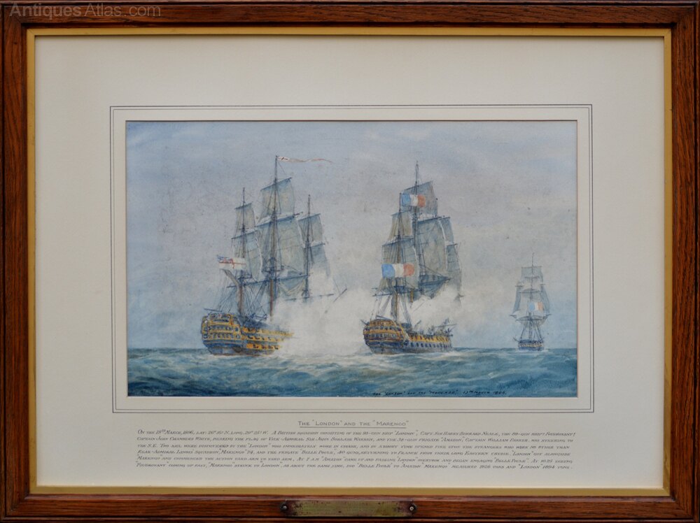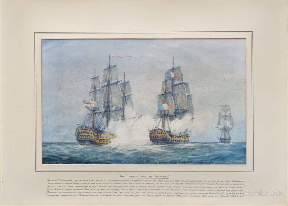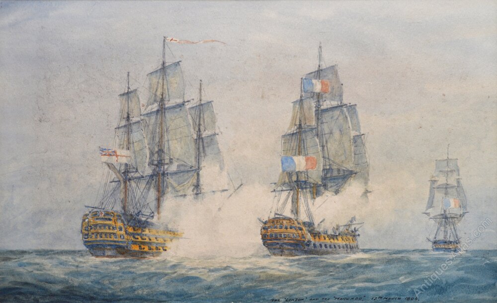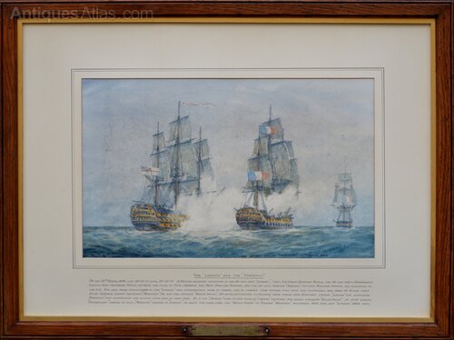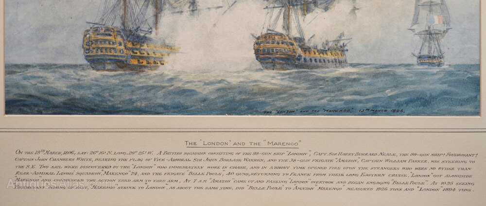 Admiral Sir Charles Burrard, Attributed – The “London” and the “Marengo”Watercolour inscribed with the title The “London” and the “Marengo.” 13th March 1806 (lower right). The picture would have been painted from memory in the 19th century, the date 1806 is the year of the event and not when the picture was painted. The inscription on the mount is handwritten in pen and black ink which gives a full description of the ships and events leading to the capture of the French squadron. The British squadron consisted of the 98-gun ship “London” Captained by Sir Harry Burrard Neale. A repeat of the description is typed onto a label which has been glued to the back of the mount. The oak frame has a brass presentation plaque as a prize for shooting, awarded to Major G. Burrard. Condition: Signs of surface dirt on the watercolour, otherwise in good condition. The frame has been polished, the glass cleaned, and the backing has been replaced using acid free board.