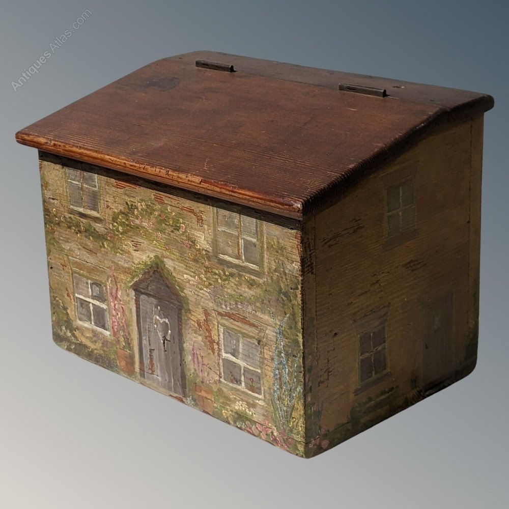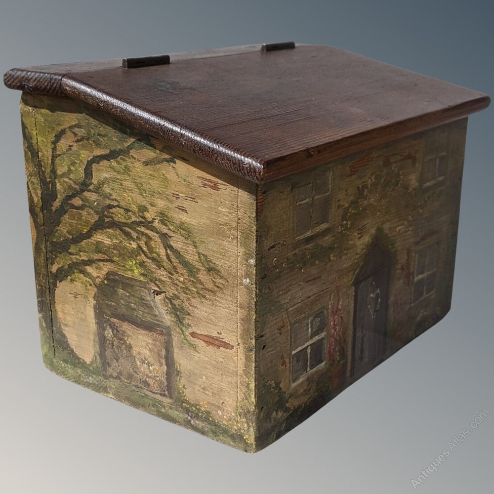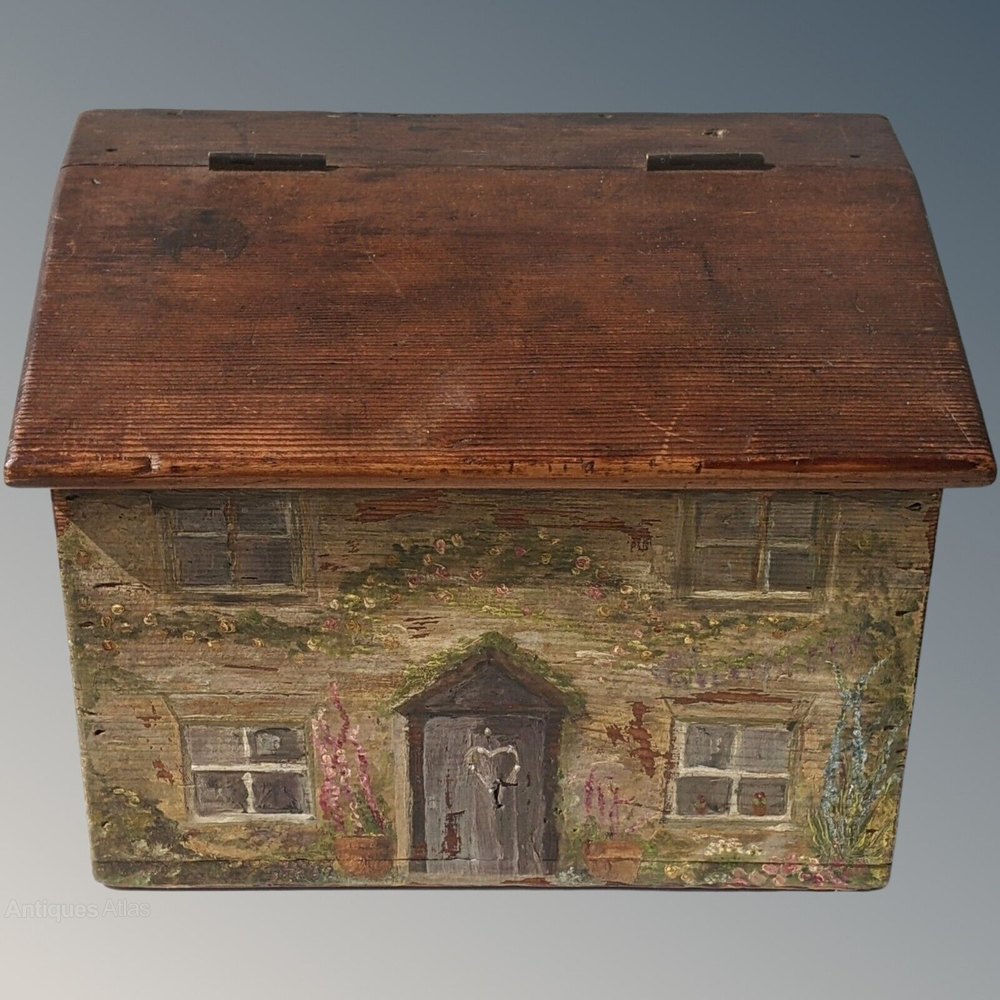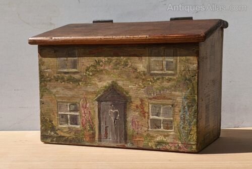 This is a really lovely early 19th century hand painted box in the form of a country cottage that dates from around 1820.The characterful pine box has a sloping hinged lid as the roof of the house with the cottage attractively painted to front and sides.