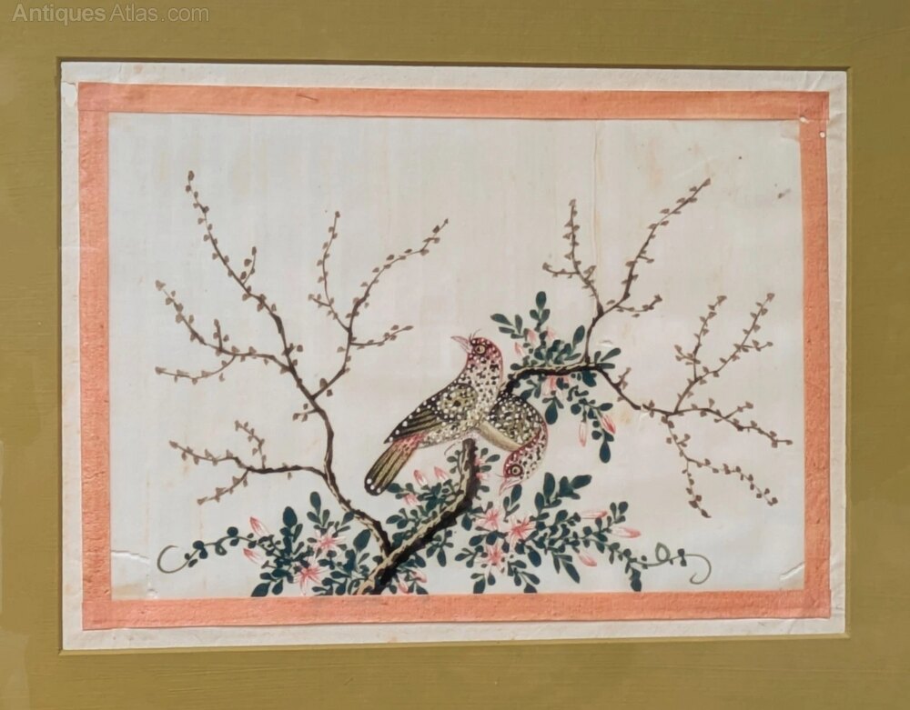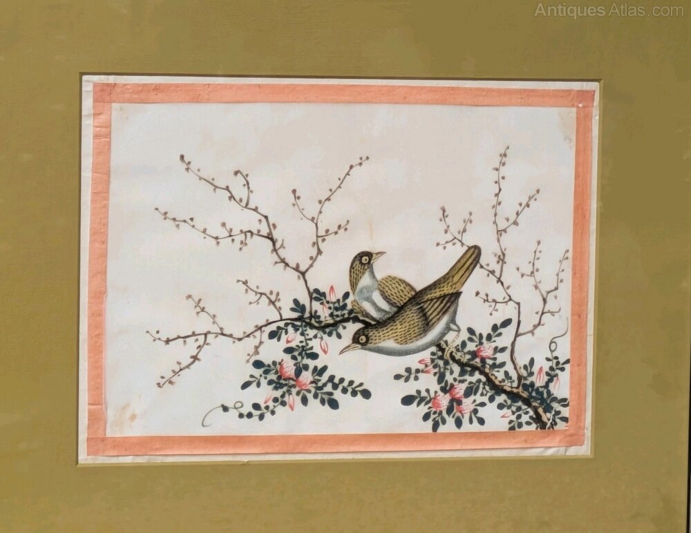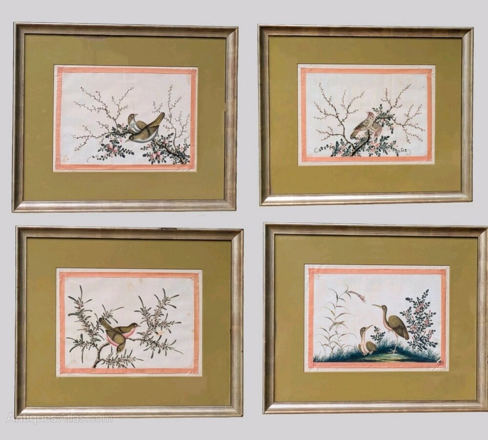 This is a quality set of Chinese gouache watercolour studies of birds which date from the mid 19th Century. The paintings depict the birds in naturalistic settings and are extremely well executed. Painted on pith in strong gouache colours, all four are in really good condition for their age. Each is framed by a single narrow peach ribbon as was typical of the time and they have more recently been mounted and displayed in good quality Italian silver gilt frames which suit them well.The four pictures measure 42.5 cms by 35.5 cms including the frames.