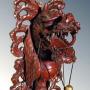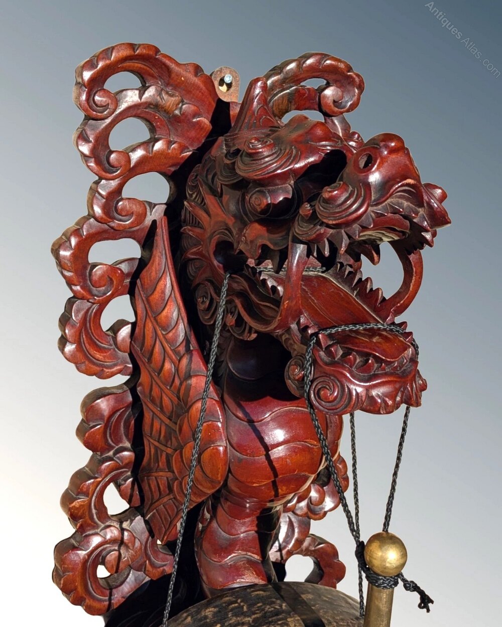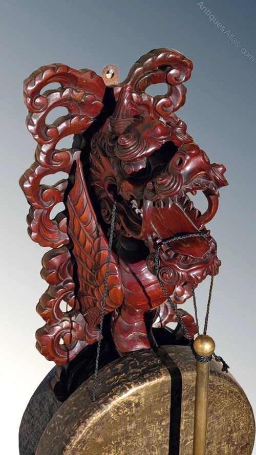 This is a fine 19th century Chinese wall mounting gong with the most wonderful large and impressive dragon hand carved in solid mahogany.The dragon holds the solid brass gong and brass and leather beater from its open mouth and sharp teeth.
