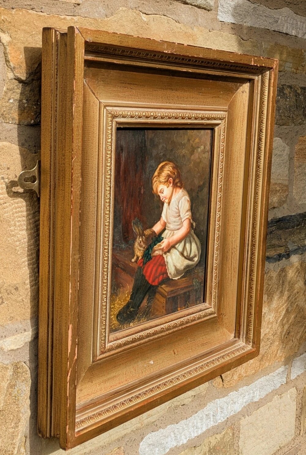 This is a charming 19th century British school oil painting depicting a young girl in a barn feeding her rabbit.The painting is well executed in oils painted onto a solid oak panel and is attractively framed in a later gilt frame that suits the work admirably. This is signed by the artist Robert Driscoll to the lower right .