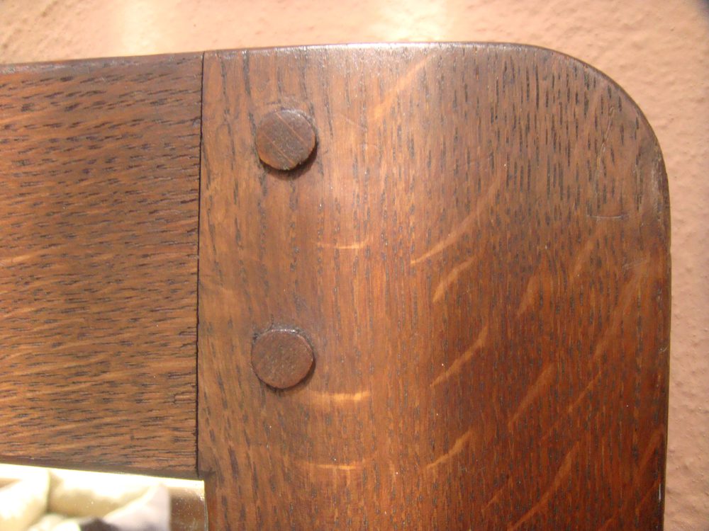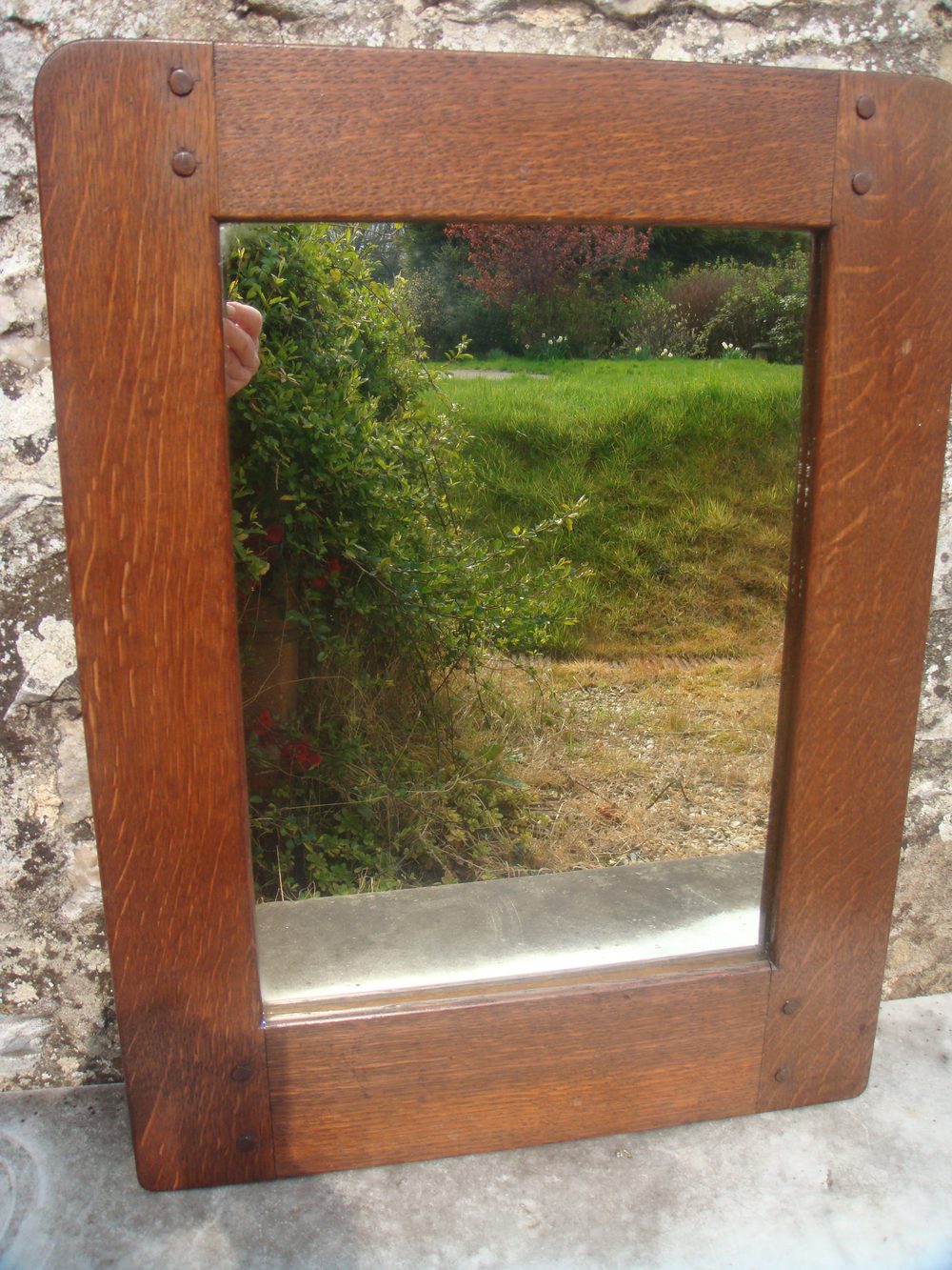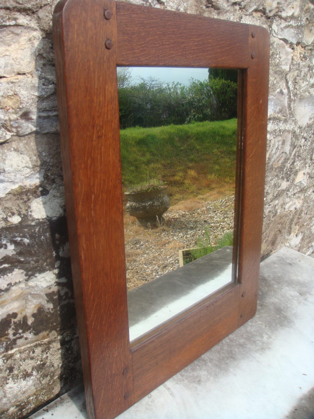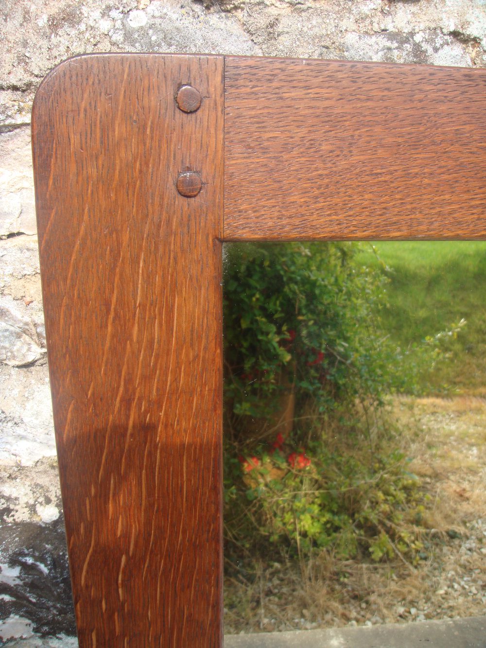 Lovely original arts & crafts oak mirror with the typical double dowelled headless peg unique to Liberty mirrors and frames.Replaced back but mirror has some wear so is possibly original.