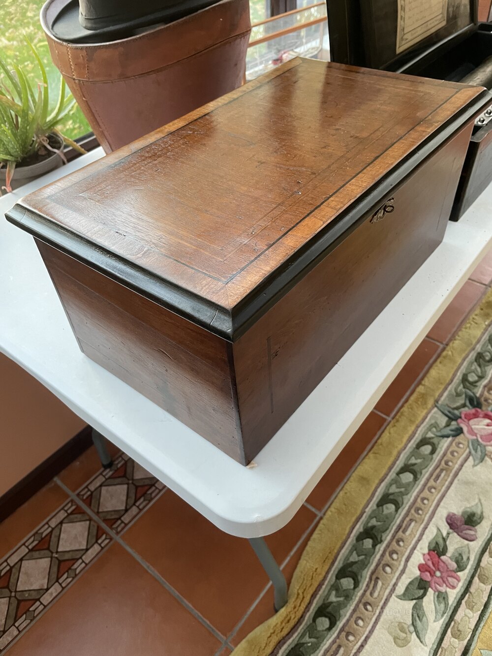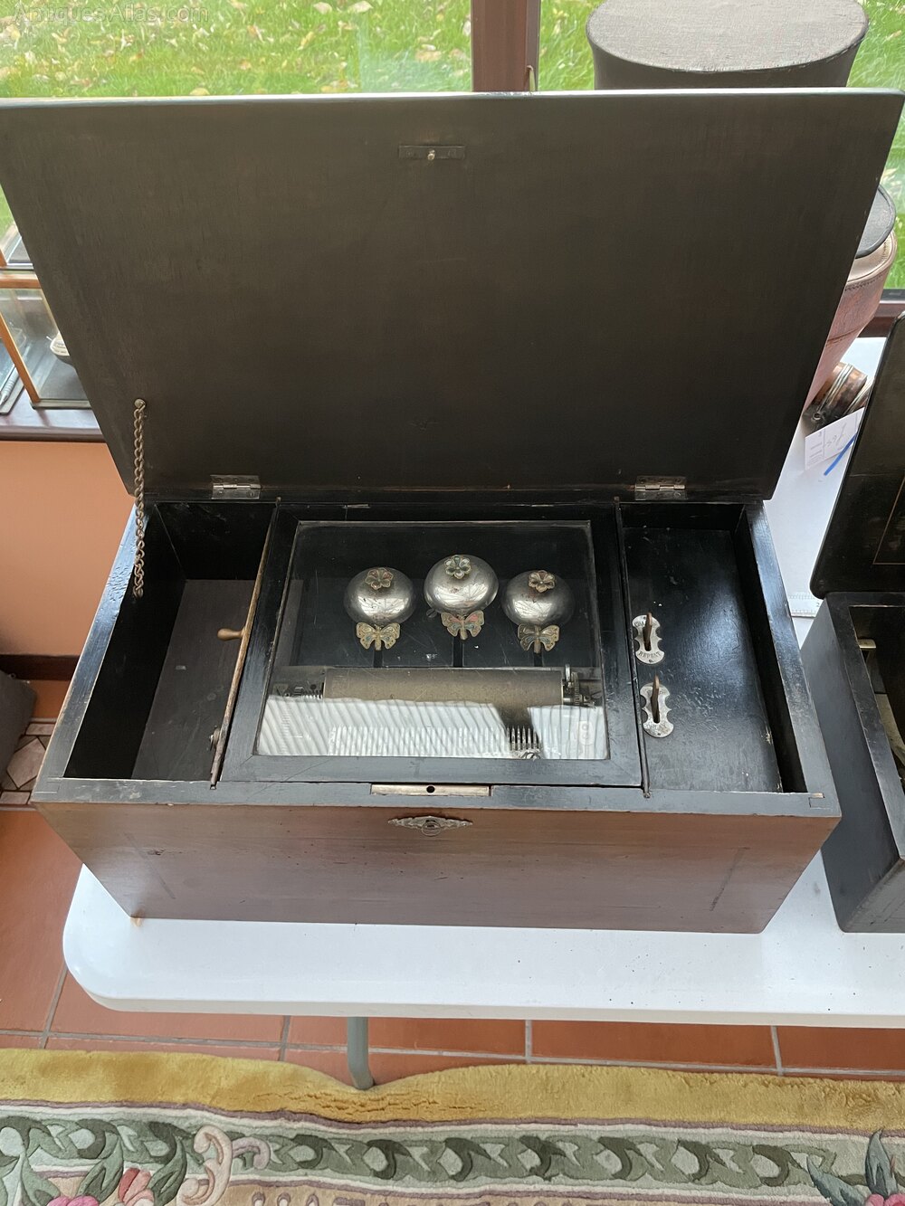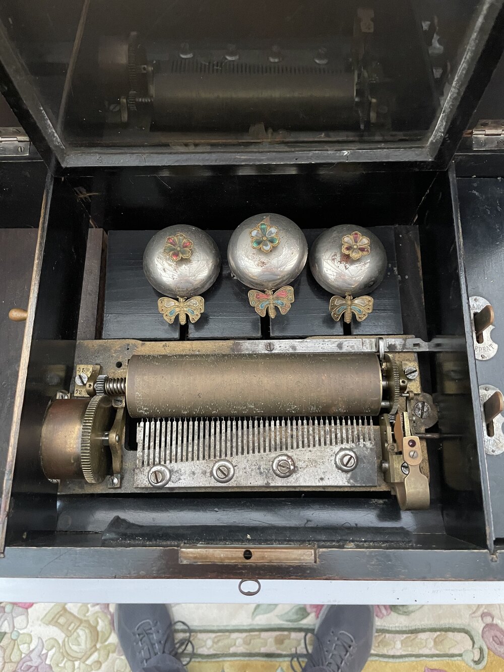 A late 19th Century Swiss Music Box playing Six Airs with three bells, plays very well in all the airsEnclosed in an mahogany and internal ebonised case with strong hinged lid with inlay