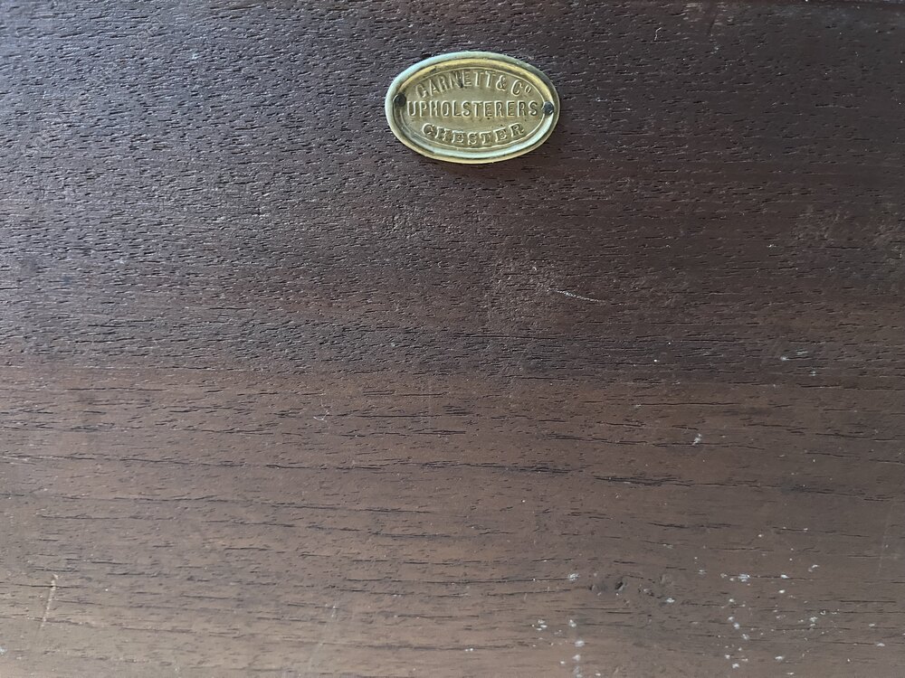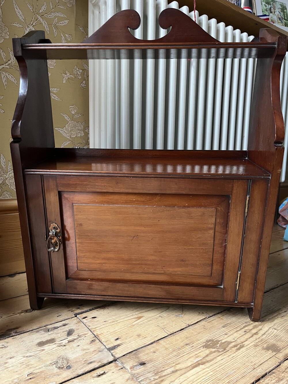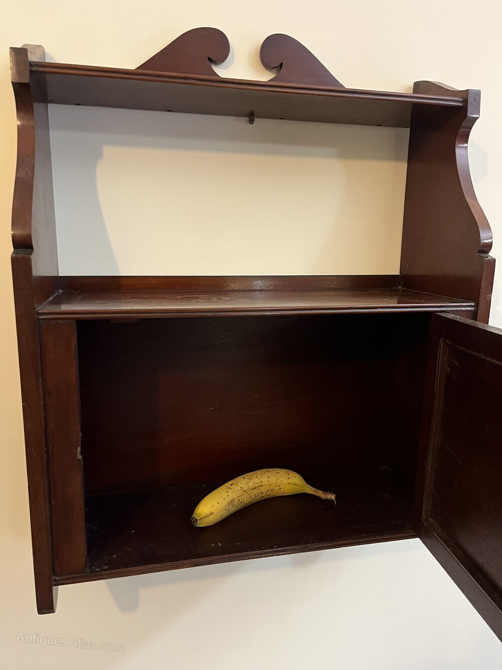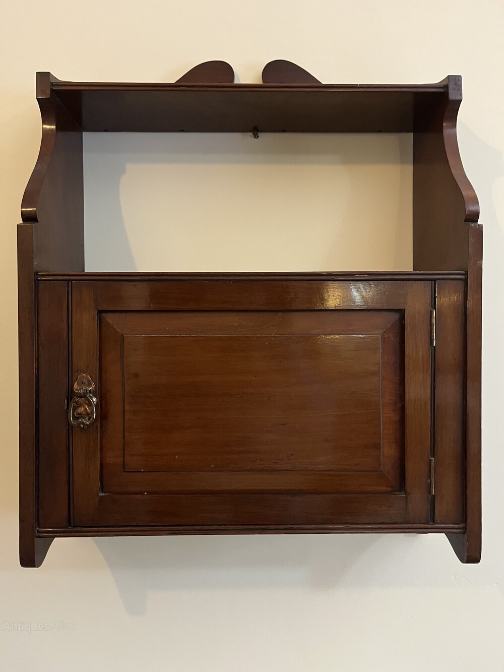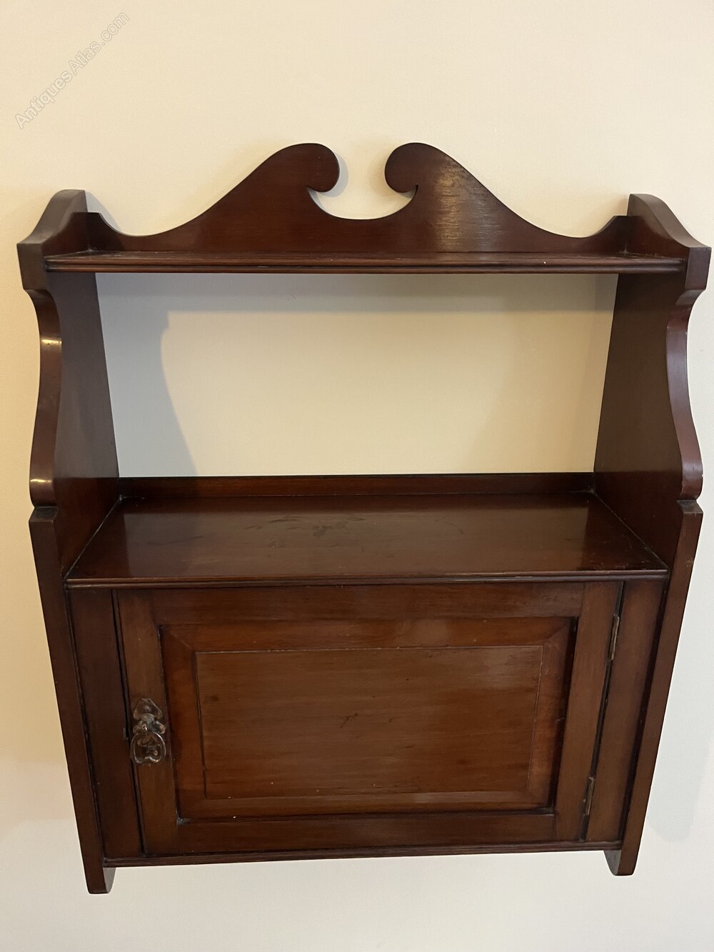 c1920's Arts & Crafts mahogany wall shelf with original maker's label. It measures 49cm wide x a max 66cm in heightDateArts and Crafts :