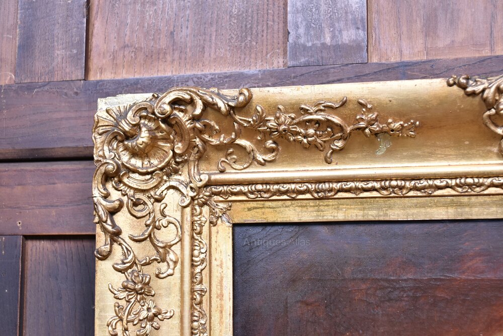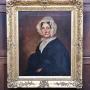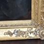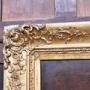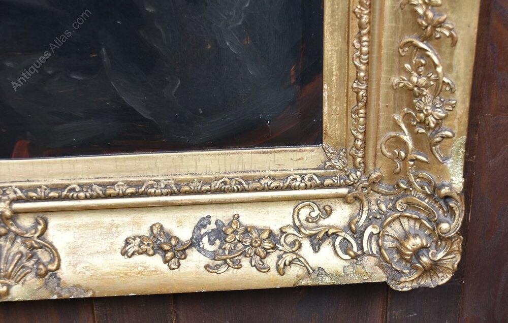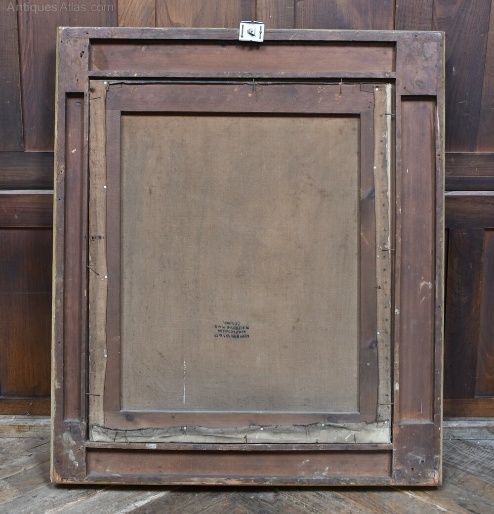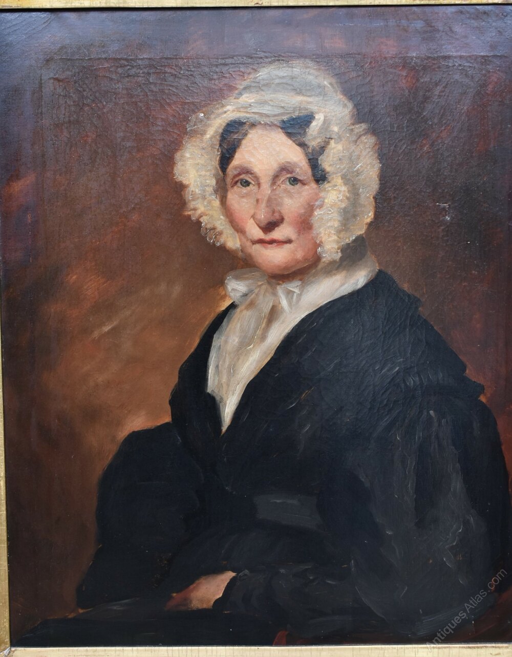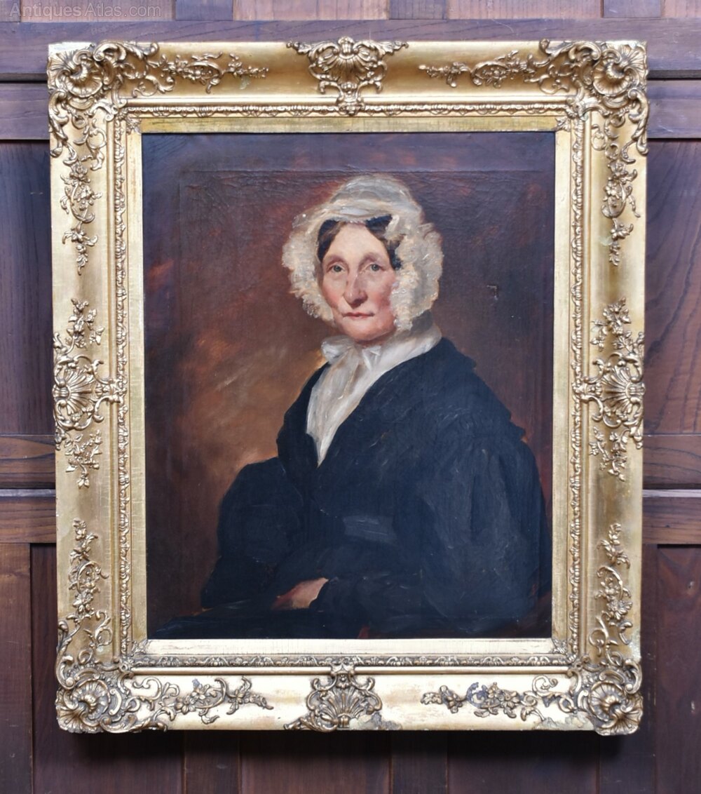 A handsome portrait captures a stately woman in sombre dress, framed by a pristine white collar and traditional bonnet. The subtly graduated dark background enhances her quiet poise, while the ornate gilt frame—decorated with scrollwork and floral accents. Minor imperfections are present, including a tear in the canvas and a small area of frame damage, both documented in the images provided. These signs of age contribute to the work’s antique charm and historical resonance.Stamped on the reverse is Geo. Rowney & Co., the prestigious manufacturer of high-quality artist supplies, long based at 21 Rathbone Place, London.