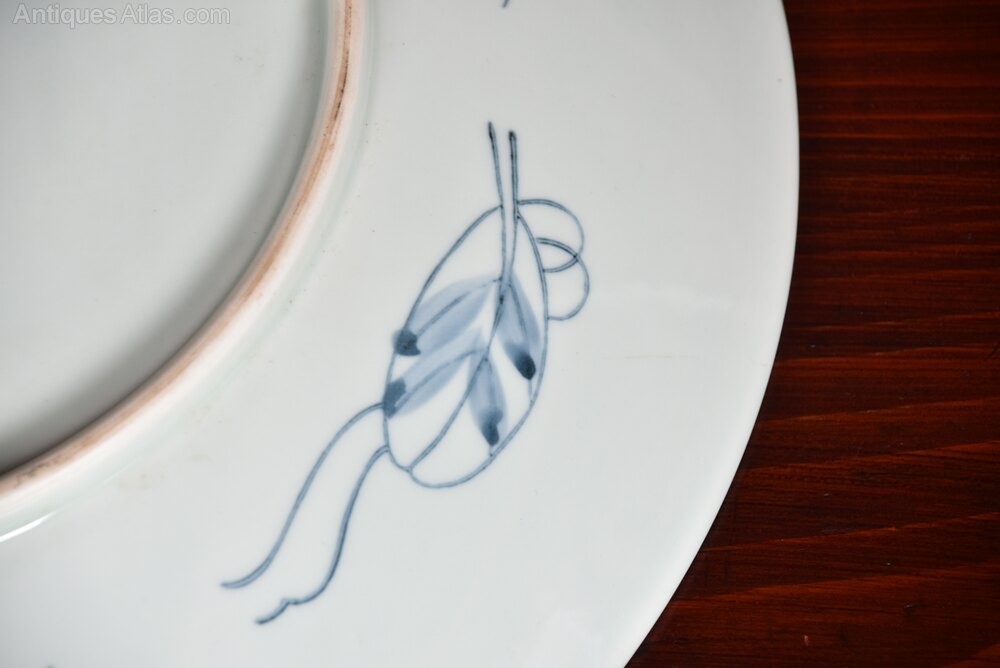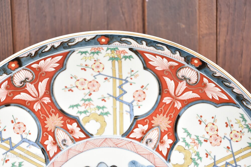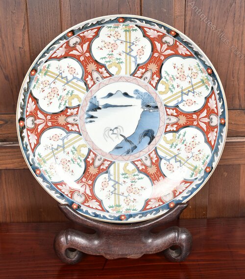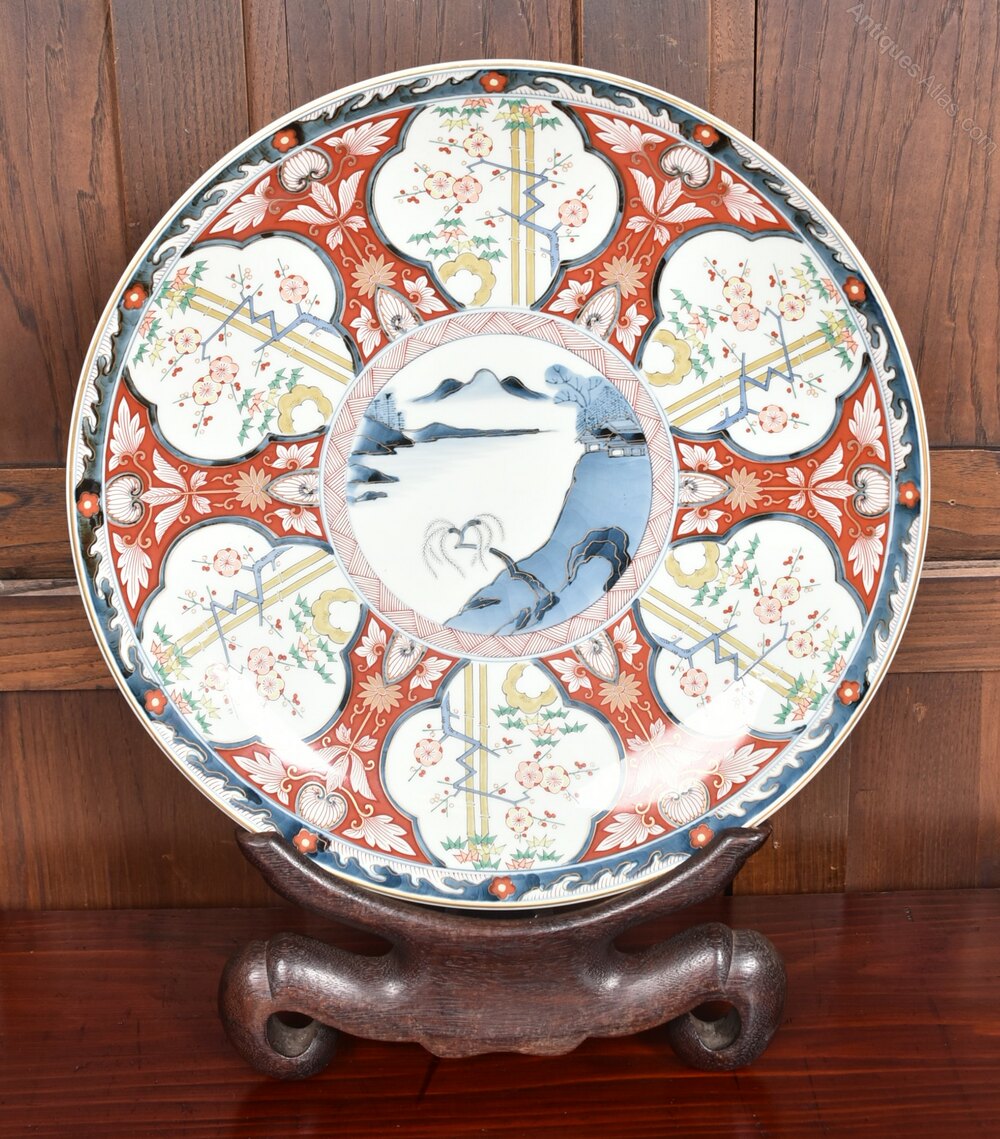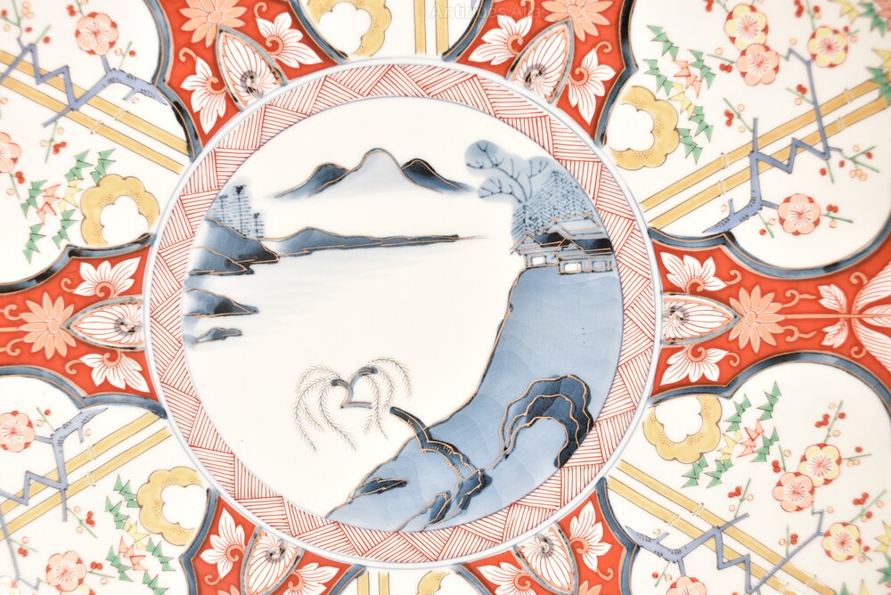A finely decorated Imari plate featuring a Tranquil blue landscape at its centre, framed by eight scalloped panels with vibrant floral motifs in iron red, white, and gold. This piece exemplifies the Imari aesthetic, combining Japanese artistry with export appeal. The intricate layering of glazes and the interplay of natural and architectural elements reflect both technical mastery and cultural symbolism.Internal Reference: SAI3863