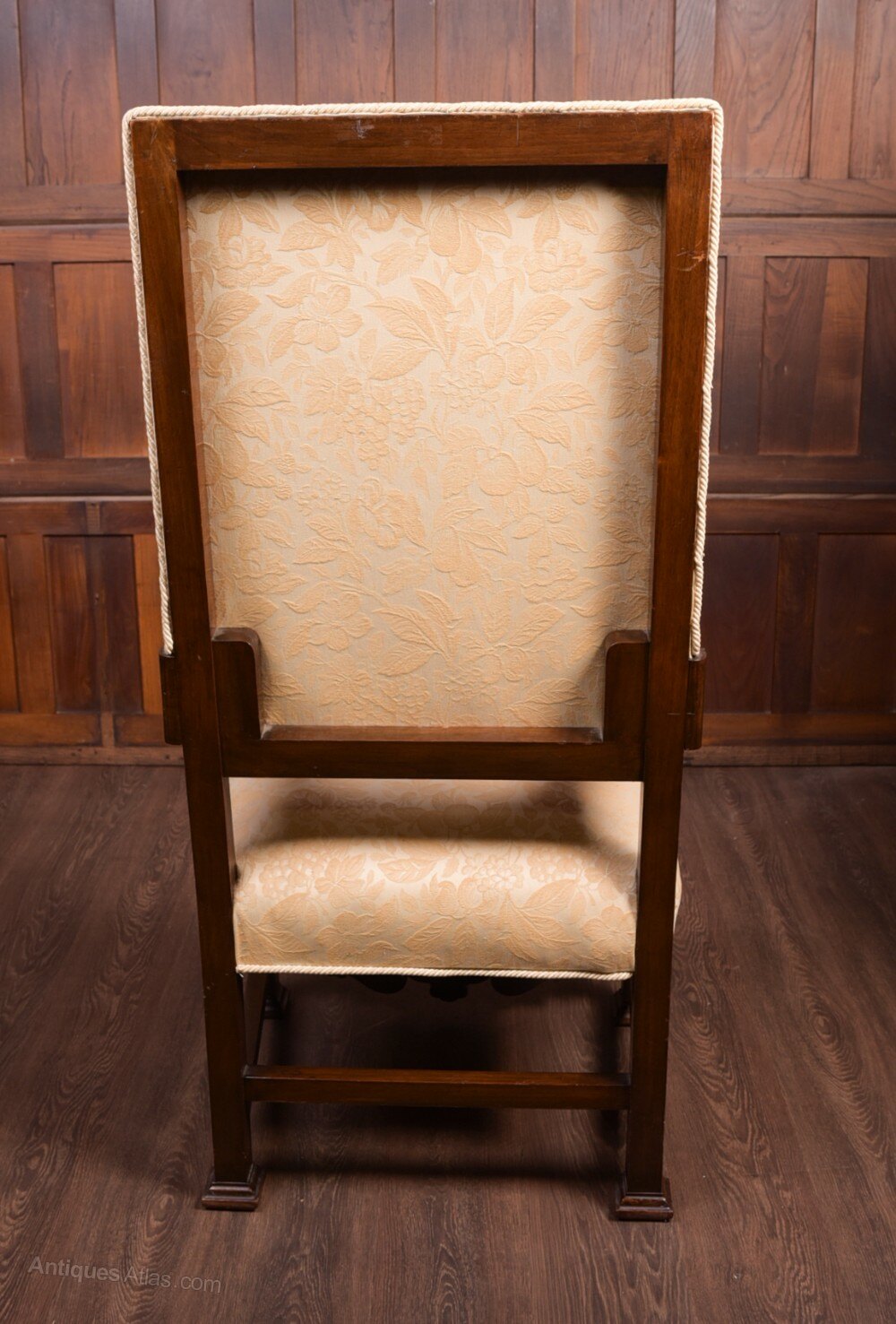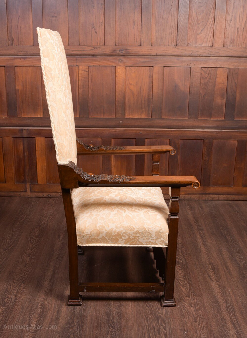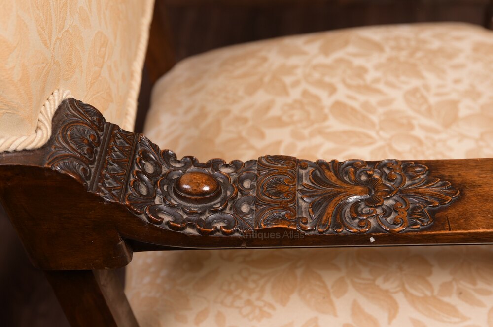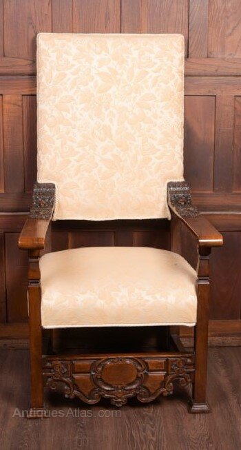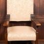 This splendid Victorian walnut throne chair embodies masterful craftsmanship and enduring elegance. Its solid walnut frame is paired with luxurious cream floral damask upholstery, pristine and untouched by marks or wear. The deep warmth of the wood contrasts beautifully with the fabric. Exquisite hand-carved detailing graces the arms and stretcher, showcasing the artisan’s skill and lending a regal presence to the piece. It stands as a commanding focal point, where historical charm meets functional grace.With a generous seat height of 50 cm, this throne chair offers comfort alongside its stately silhouette, making it a distinguished addition to any interior.