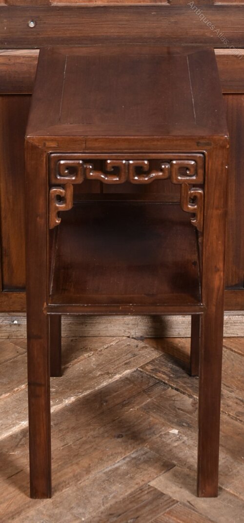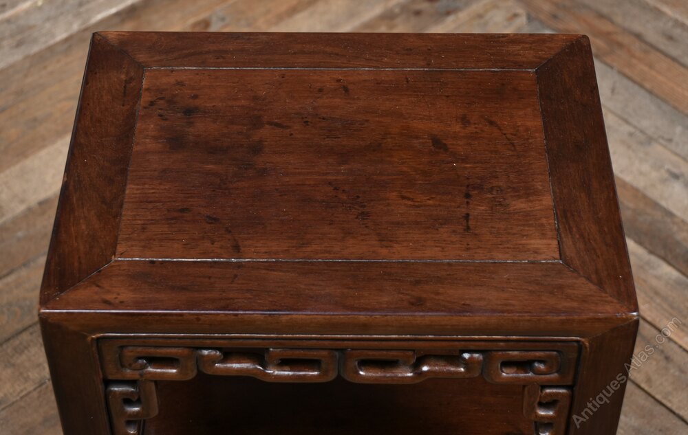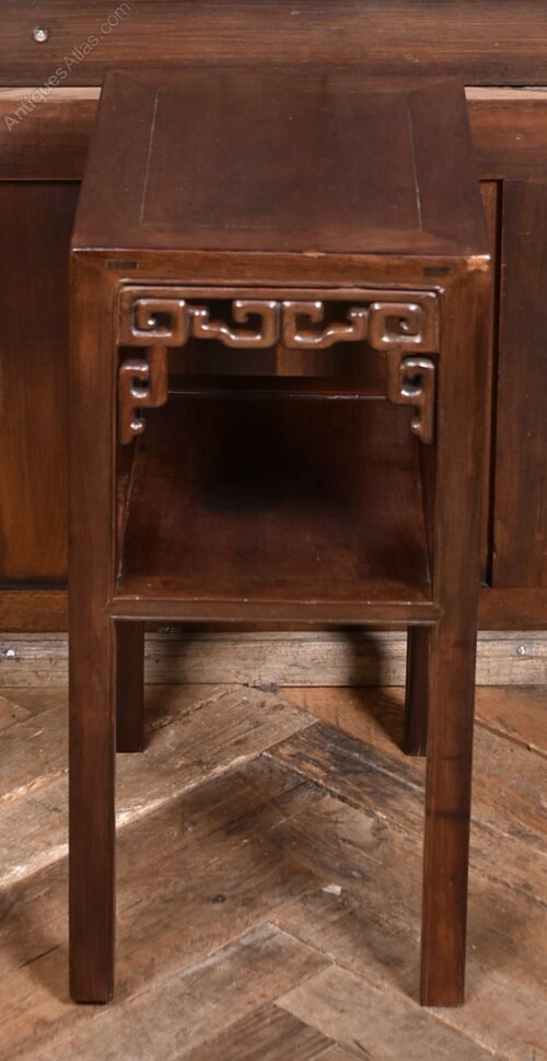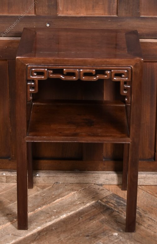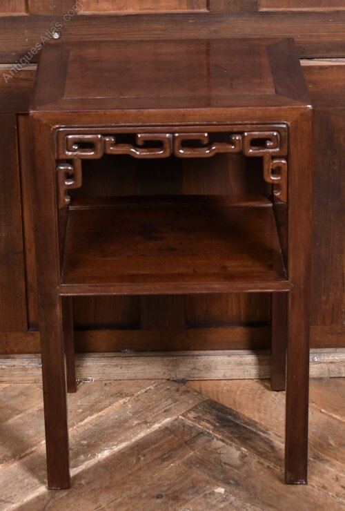 A Chinese hardwood side table in excellent condition. The rectangular top sits above a pierced apron carved with a repeating geometric motif, supported by four straight legs joined by a lower shelf. With its dark polished finish and restrained proportions, this piece offers both decorative appeal and practical versatility ideal as a lamp table or occasional stand.Internal Reference: SAI3926