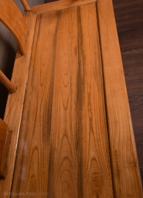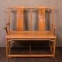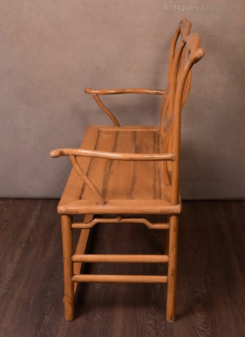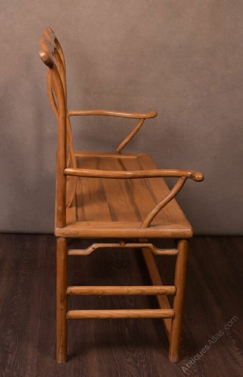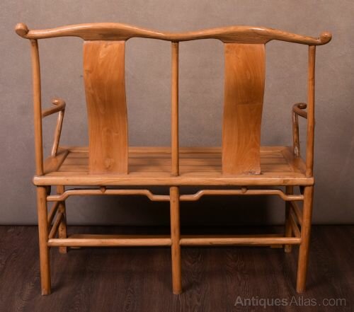 Wonderful Chinese blonde wood double-seat bench in beautifully preserved original condition. The shaped top rail crowns two vertical splats, each carved with delicate, symmetrical motifs that speak to traditional craftsmanship. Gently curved arms flow into a panelled seat, supported by five turned legs joined by stretchers for stability. The pale wood has developed a soft patina, enhancing its warmth and character. A striking yet understated piece that would lend elegance to any interior.Internal Reference: SAI1773