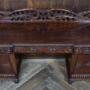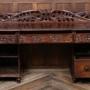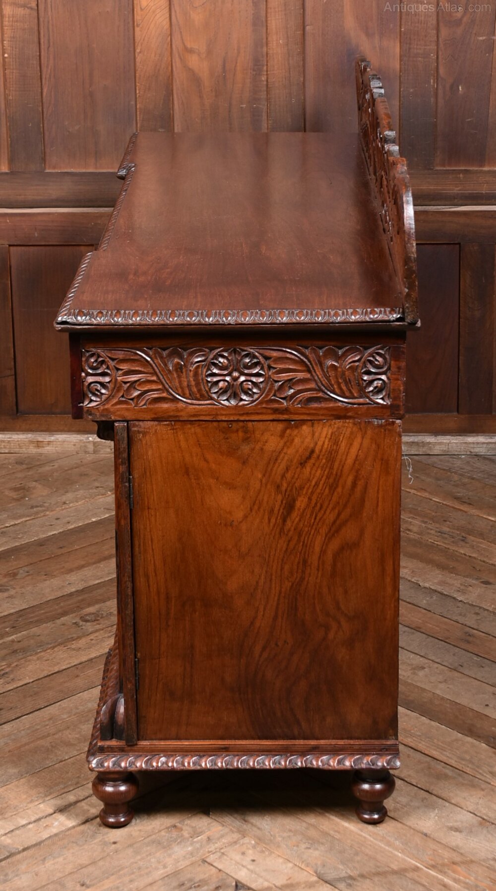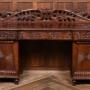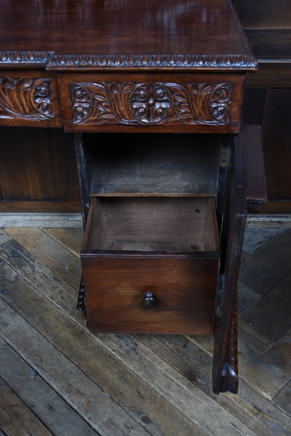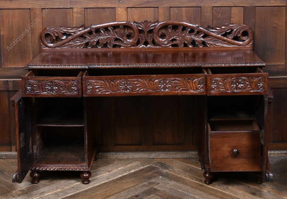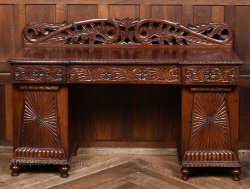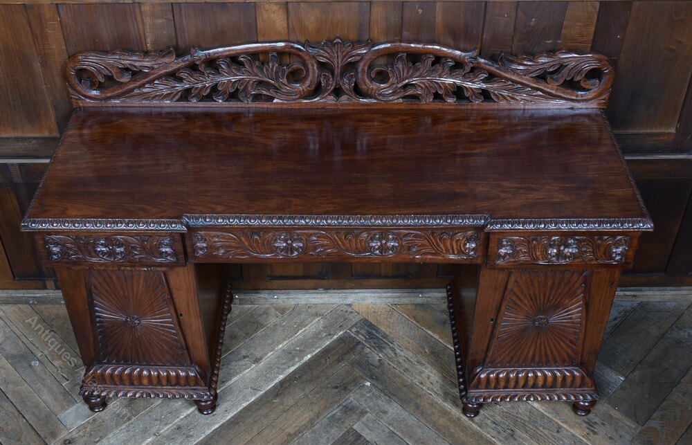 An exceptional twin pedestal sideboard crafted from richly toned Padouk, presented in excellent antique condition. The pedestals offer practical storage, one housing a full-length cupboard, the other featuring a cellarette drawer, each resting on wide gadrooned bases with fluted feet and doors adorned with radiant sunburst carvings. The upper section comprises of three discreet drawers concealed within the frieze, each intricately carved with a flowing leaf and flower motif. The top itself is fashioned from a single slab of Padouk, edged with fine carving, and crowned by a beautifully detailed back gallery with a graceful leaf design. While bearing the gentle signs of age that lend authenticity to antique furniture, this is a solid and impressive piece with strong architectural presence. Its warm colour, elegant proportions, and decorative detailing make it a versatile addition to both traditional and contemporary interiors.Internal Reference: SAI3949