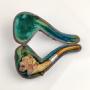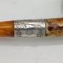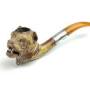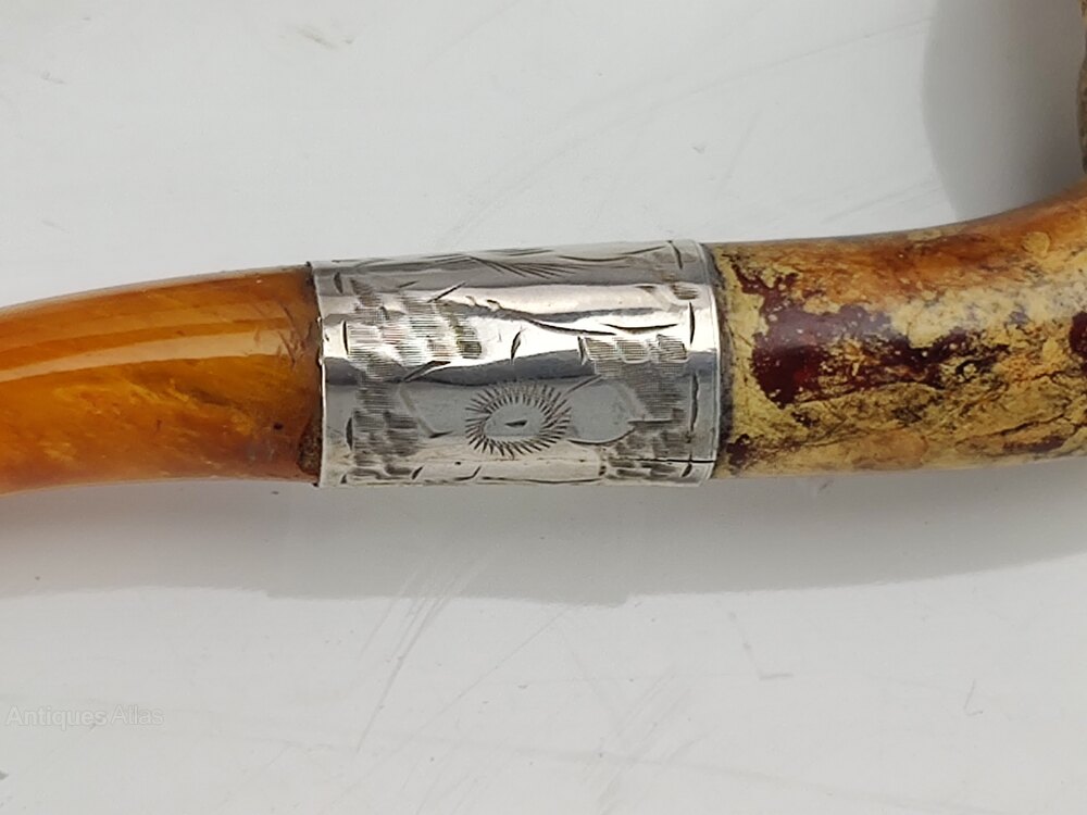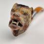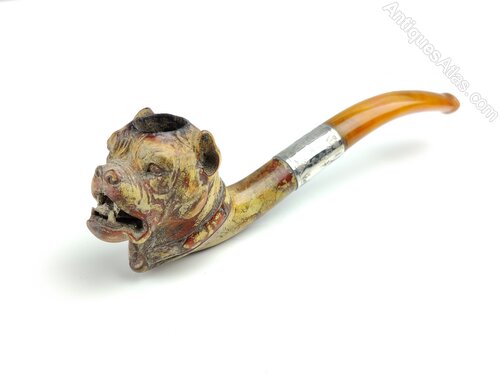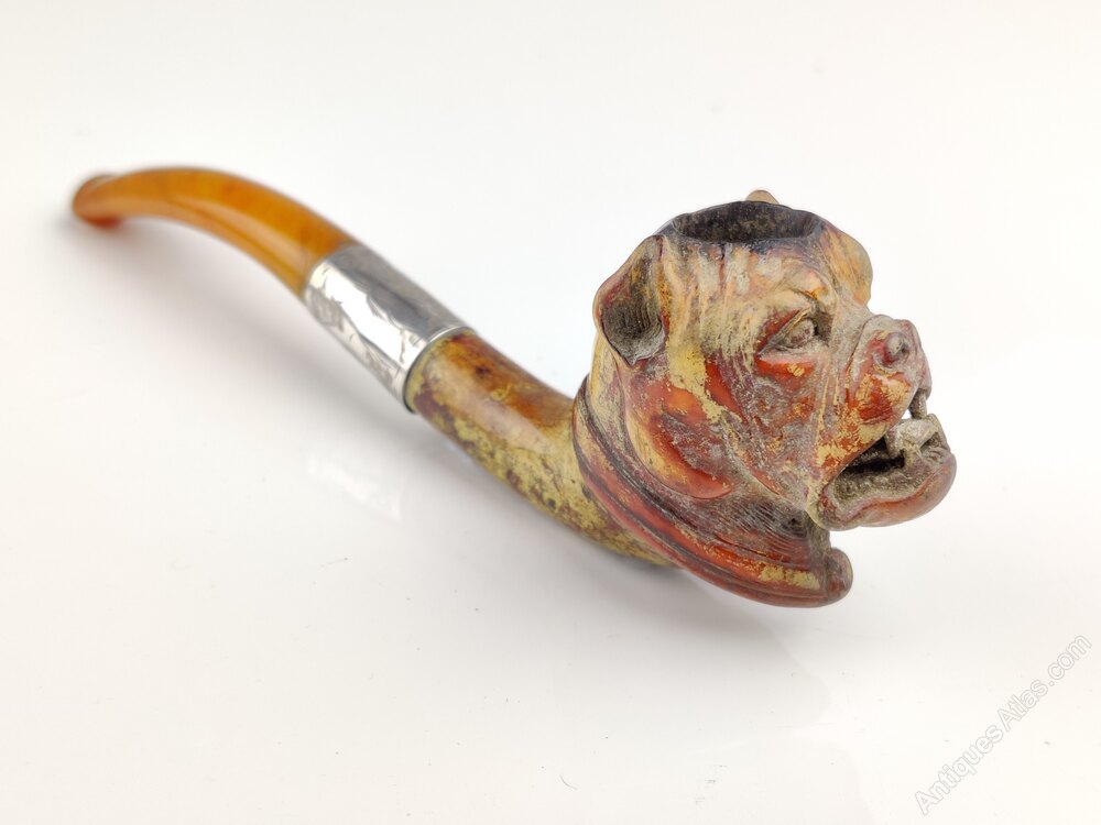 An exceptional 1880s carved Meerschaum "Bulldog" with engraved silver collar with the initials BW, amber cheroot/pipe, cased in original case.This is without doubt a beautiful shaped and carved meerschaum, modelled as a bulldog. Having been smoked over the last 100 + years truly adds to the patina and character, also adding to its value and overall beauty. In its original leather case.