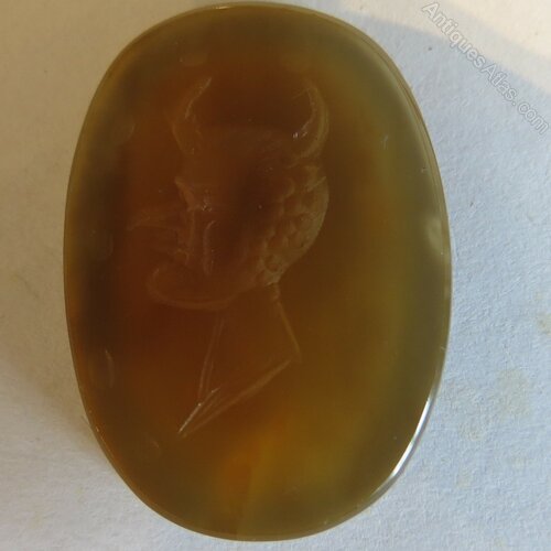 Unusual collectable antique intaglio.An 18th or 19th century oval carnelian intaglio. The interesting carving depicts head and shoulders profile of a faun or satyr with a large protruding chin and nose and curved horns within a border of dots. Probably originally a seal. (28mm x 20mm).