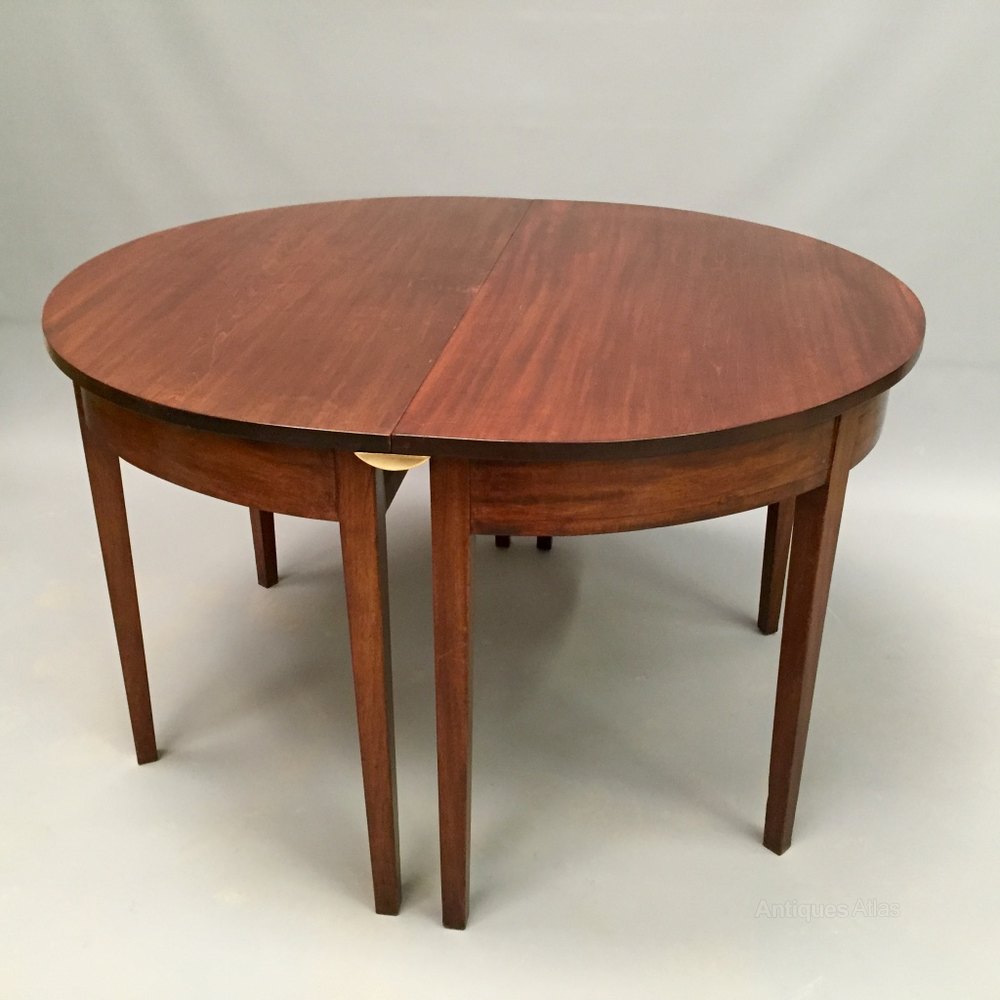 Good quality and useful size original mahogany Georgian extending dining table with one removable leaf, circa 1830This is a very flexible table, giving you the option of a lovely round 4 to 6 seater table, then an 8 seater with the leaf added...please see the photos, to see how the table splits, but can also be used as just a pair of Demi lune console tables too