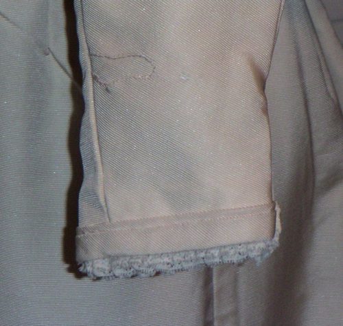 The condition of the fabric is excellent and wearable. There are a few small flaws however that I ought to detail. There is a repair to the underside of one of the sleeves near the cuff and there are also some tiny holes in the back of the bodice which can be seen in the photographs, and one small hole in the train about midway between the waist and the hem. There is very slight staining in the underarm area on the lining but this does not show on the outside. It seems that the dress has been very little worn and there is no damage as such. The hem of the train is clean and not scuffed.