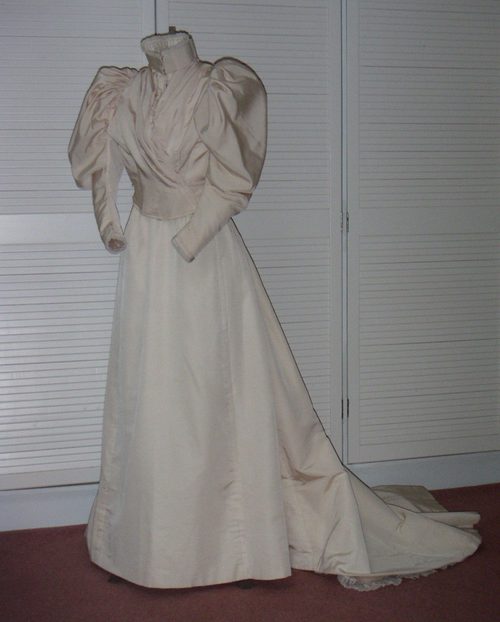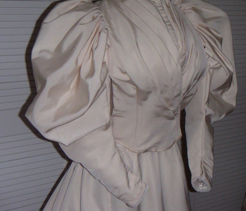 This is a beautiful example of a late Victorian two piece day dress, c.1895-1900, in a fine corded cream silk. The bodice is fitted, with softly folded detail at the front, with a fitted back which has a detachable stiffened bow which is anchored with hooks and eyes. The bodice has an inner silk ribbon which fastens inside to pull in the waist. It is boned and fastens down the centre front with hooks and eyes and the right side of the bodice then folds over to fasten on the right. The sleeves are very fully gathered and lined throughout, in a typical “leg of mutton” style so popular at this time, and finish in a narrow cuff. The stand up collar is stiffened and trimmed with narrow double pleated lace as are the cuffs.The skirt falls straight at the front and is closely gathered for a bustle at the back. It is fully lined in cotton sateen and has a long train which is decorated on the underside with a deep ruffle of stiff cotton and lace. The waistband bears the words “R.H. A. Woodman, Robes et Manteaux, Ventnor”.