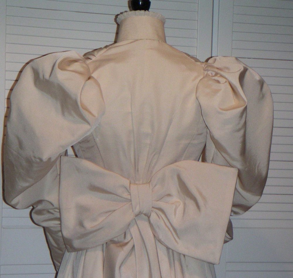This dress was part of the contents of a trunk containing Victorian clothes, purchased at auction. The bodice and sleeves had been partially unpicked, perhaps with a view to alteration. These have been carefully restored to their original form, and great care has been taken to use natural fabrics for stiffening the bow and finishing the seams.