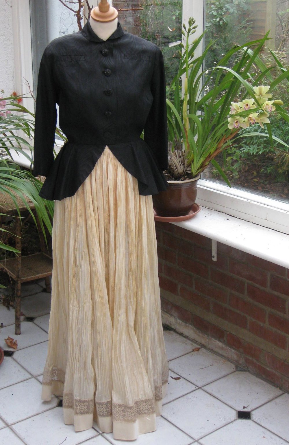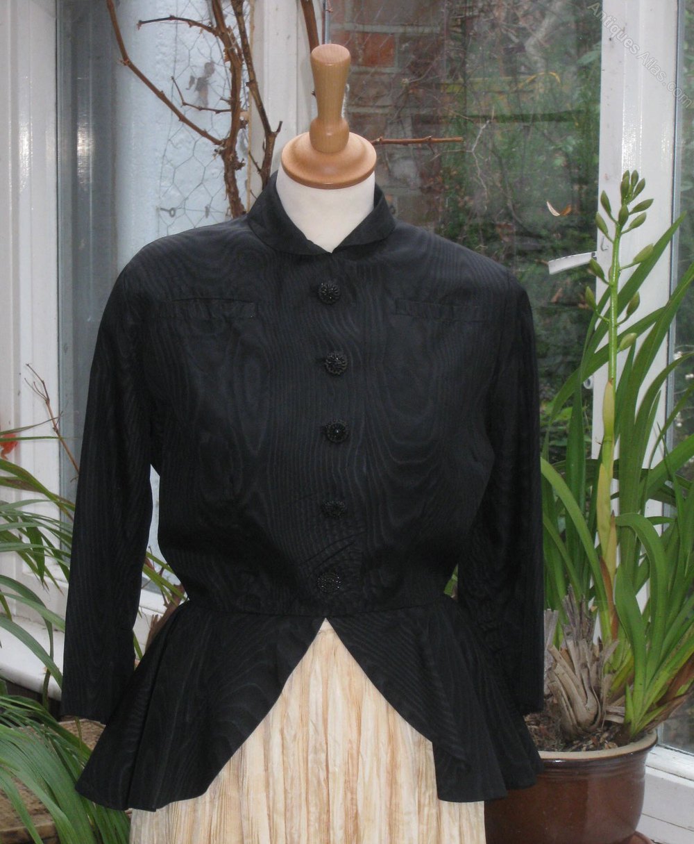 This is a tailored elegant jacket designed by Rosalind Gilbert and made of black moiré or watered silk. I have so far not been able to find out much about this designer, only that she was exhibiting in London fashion shows in 1947.The jacket has a fitted waist, a peplum which is elongated at the back into a long section which is weighted, and fitted narrow sleeves. The bodice buttons up to the neck which was a narrow collar, with moulded glass buttons. There are two small pockets at yoke height.