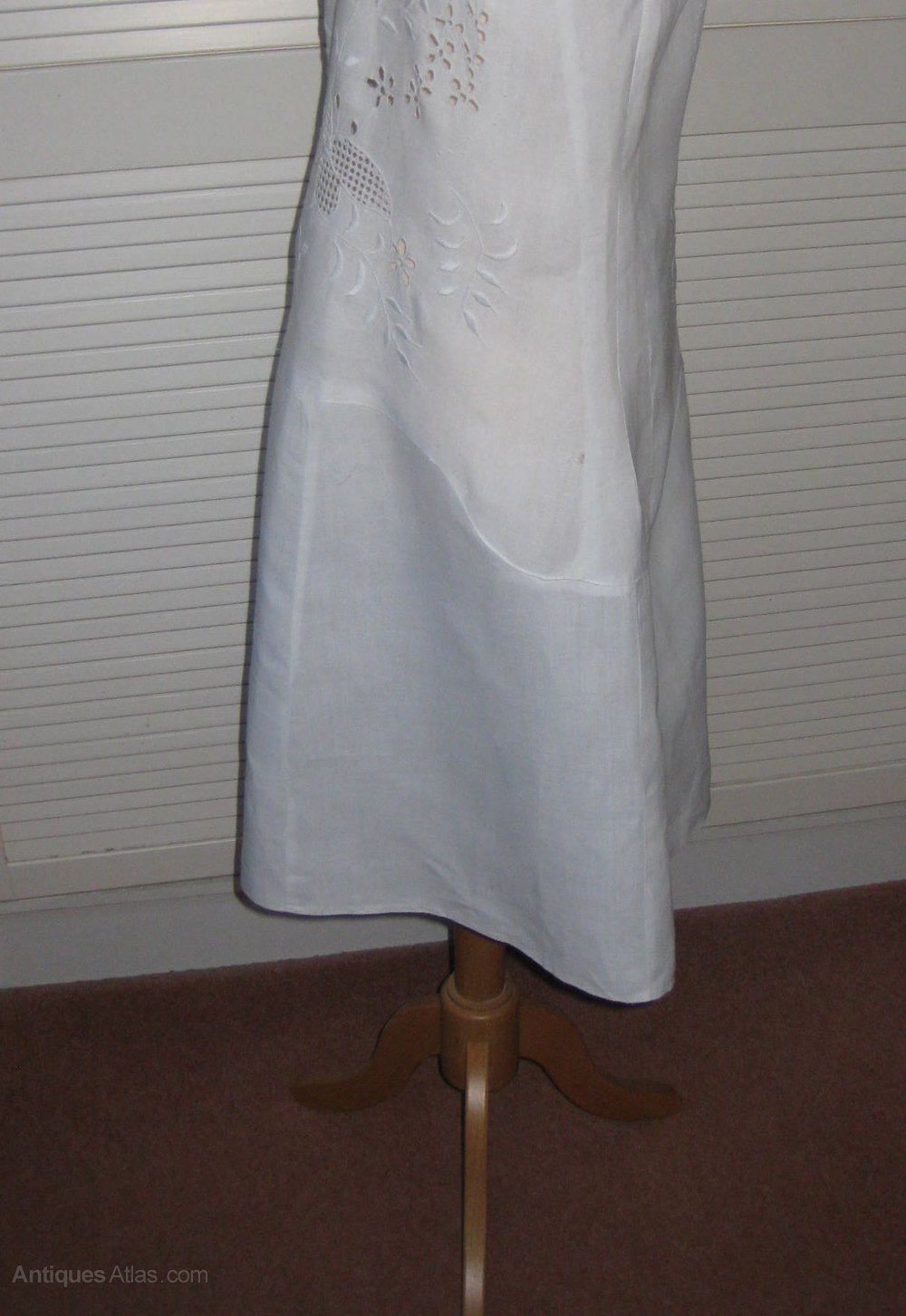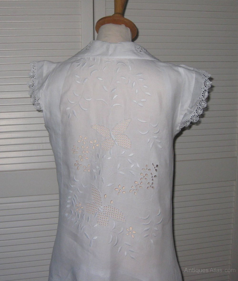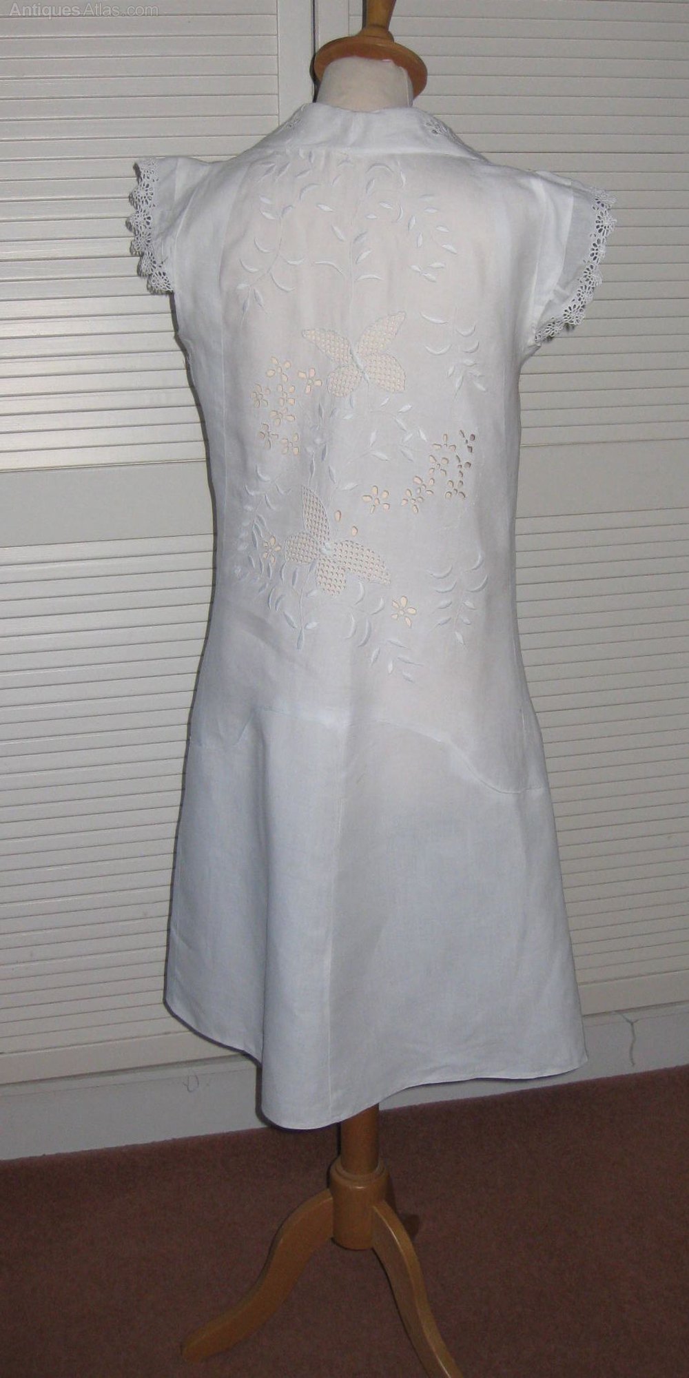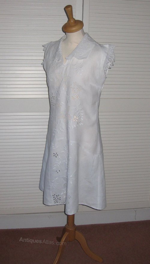 This is a vintage tennis dress dating I think from the 1930/1940s, in embroidered cotton. It has a fitted waist and flared skirt and cap sleeves of broderie anglaise. There is also a collar with butterfly motifs. The front and back sections are embroidered in white and have a design of butterflies and sprays of flowers. The skirt section is attached with attractive curved seaming which adds interest to the garment. There are no side seam or back openings, the garment is designed to slip on over the head.The fabric used for this garment is very reminiscent of bedspreads of an earlier era, and I do wonder if this garment was made from one during the second world war when clothing was rationed and a tennis dress would be considered a luxury!