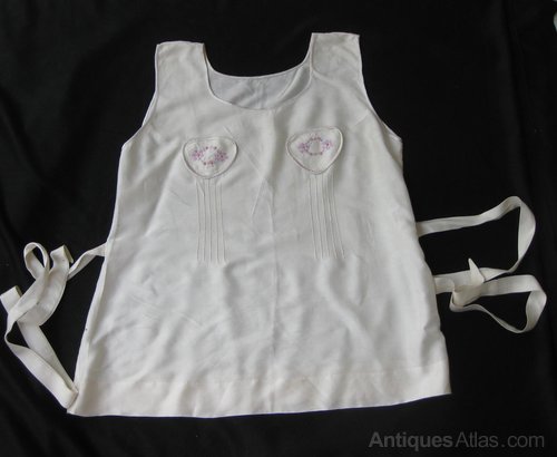 This is a delightful child’s dress dating from the 1930s, in cream silk. It is sleeveless, with bound armholes. There are pintucks to shape the waist and also two embroidered small pockets on the bodice which are decorated with a tiny wreath of hand embroidered flowers. There is a long belt at the waist.The dress is loose fitting, the chest measurement is 34 inches (88 cms.) and the length from shoulder to hem is 22 inches (56 cms.).
