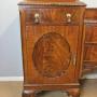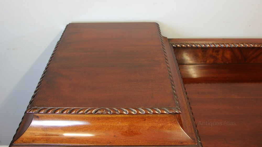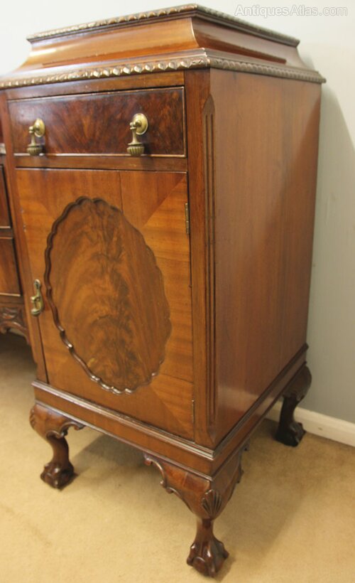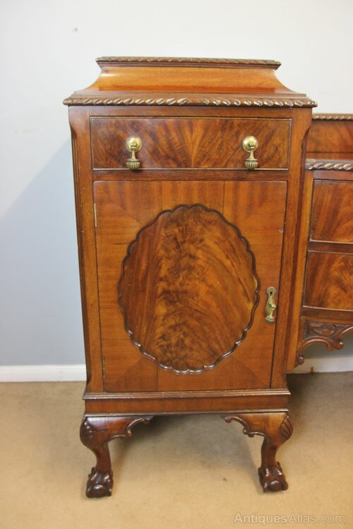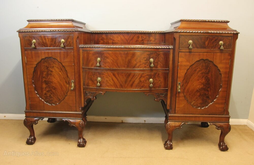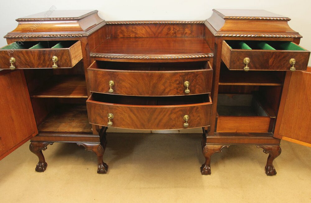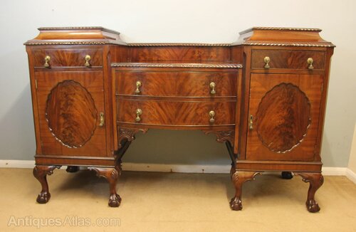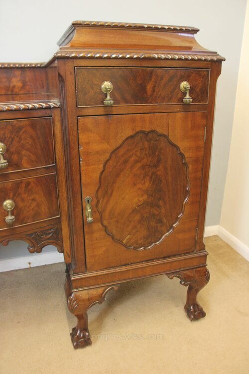 Antique Chippendale Style Ball Claw Mahogany Sideboard, This early twentieth century mahogany sideboard in the Chippendale style has a stepped top with a pair bowed drawers to the centre flanked by pedestals with upper drawers over opening cupboards enclosing a single shelf to both sections. The right hand section is fitted with a base drawer All supported by short cabriole legs with carved shell decoration with ball claw feet,-