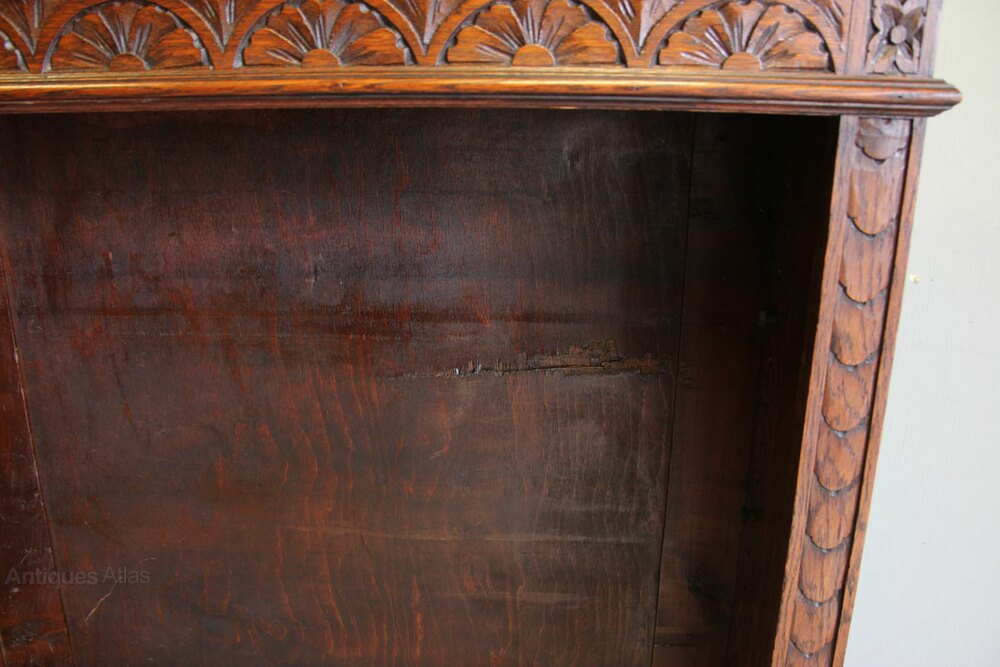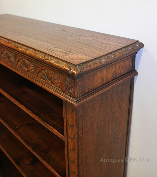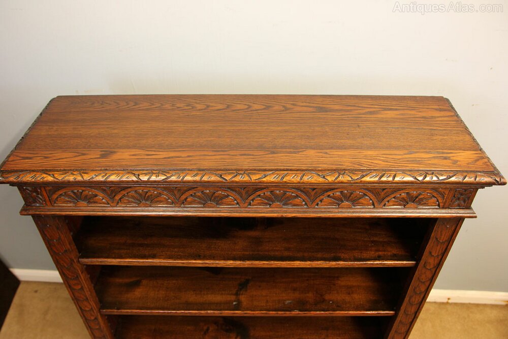 Antique Carved Oak Open Bookcase, This antique carved oak open bookcase has a rectangular top with carved edge and carved detail under and to either side and has three adjustable shelves,-