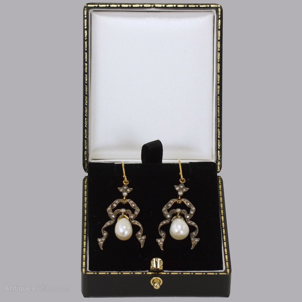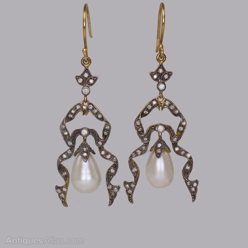 Suspended below a ribbon motif in turn suspending a diamond capped pearl