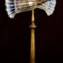 Stylishly constructed and of high quality, the imposing lamp has a tall octagonal form graduated pillar form base surmounted with a most unusual twin armed light shade holder to showcase the vaseline glass shade arrangement.