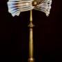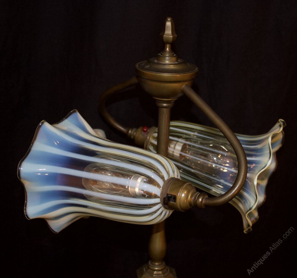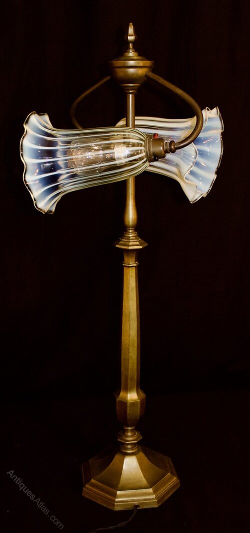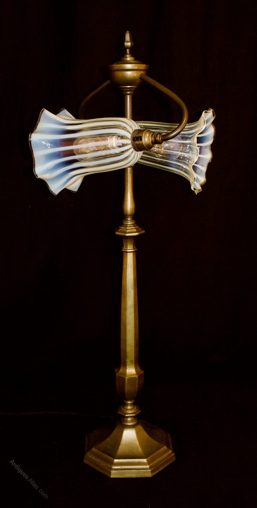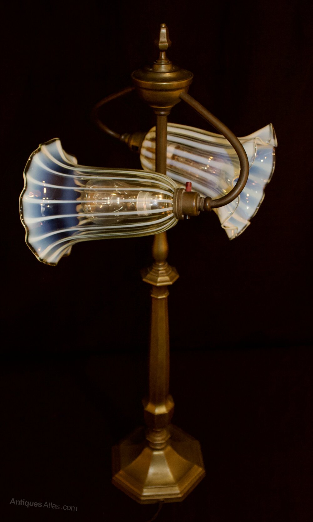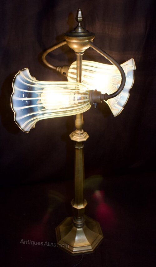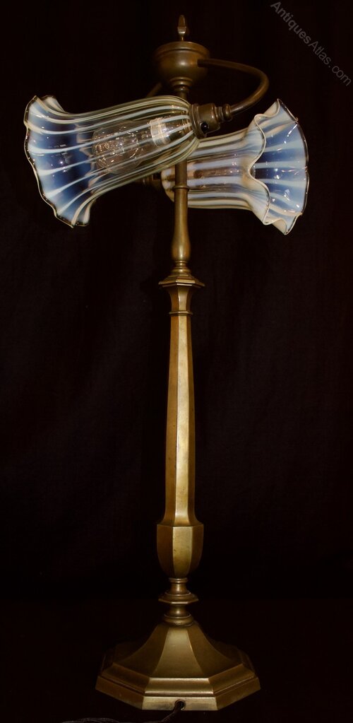 Arts and Crafts Jesson & Birkett Brass Lamp with W.A.S. Benson Vaseline Glass ShadesA stylish and rare large size Edwardian Arts and Crafts brass octagonal form double arm table lamp by Jesson & Birkett fully complete with its original matching candy stripe vaseline glass lamp shades made by James Powell & Sons c1905.