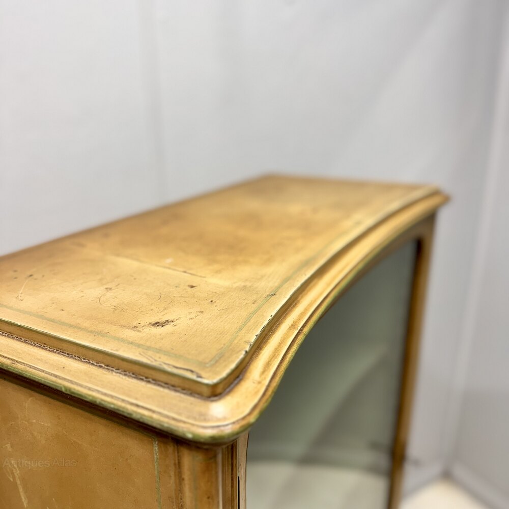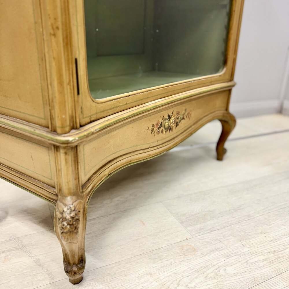 Very decorative and elegant French painted concave glass front adjustable bookcase or vitrine display cabinet, circa 1900.Unusual piece with the concave front and also stands on four well carved and shaped cabriole legs.