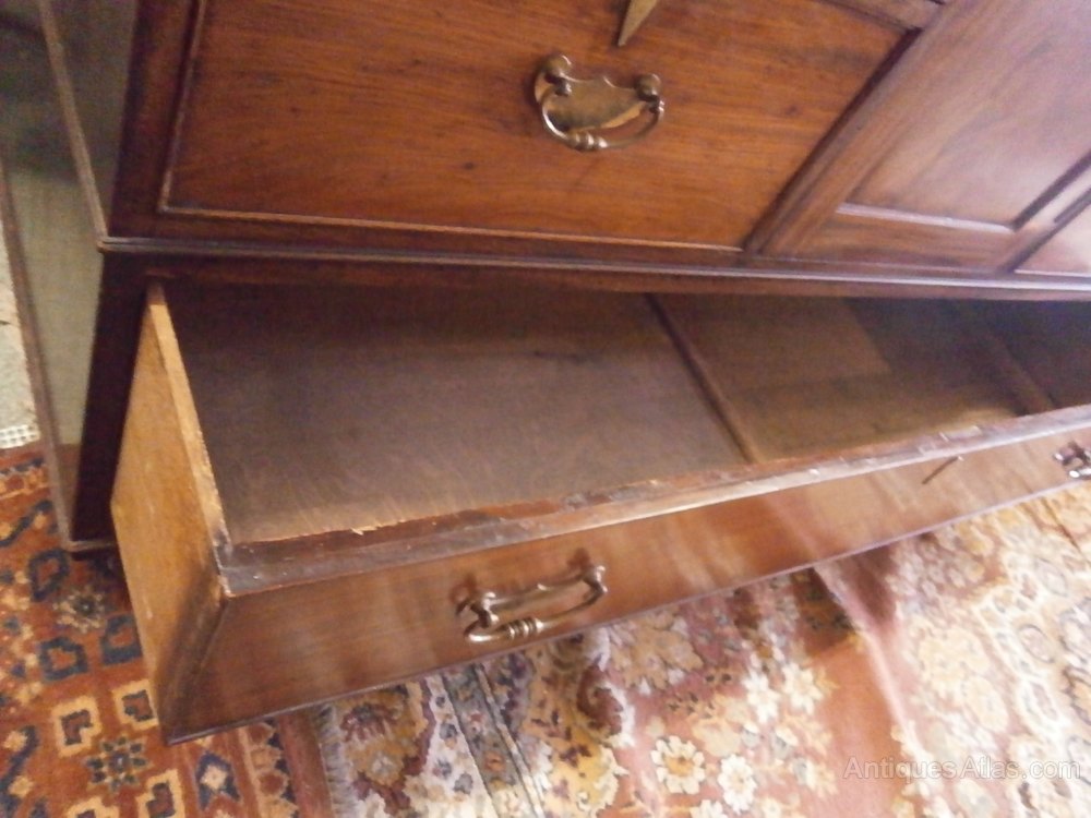 Considering it's age and use it is not really in a bad state of repair. It has some knock and bangs which are to be expected. The have been some repairs here and there but it is altogether a very solid piece.There are some pieces of veneer missing from the sides back edge, some repairs. A very old split down the right hand side of the base. The drawers are oak with front os mahogany veneered pine.