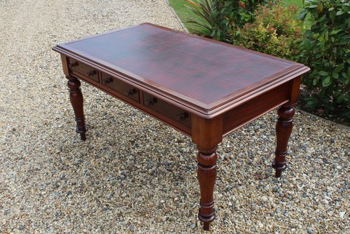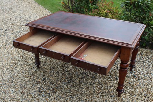 This is a superb large leather lined desk, it has three very deep drawers. The height to kneehole is 22" The entire desk is in excellent order throughout. It has a new deep maroon leather.H. 29 1/4" W 32 3/4" L. 56 3/4"