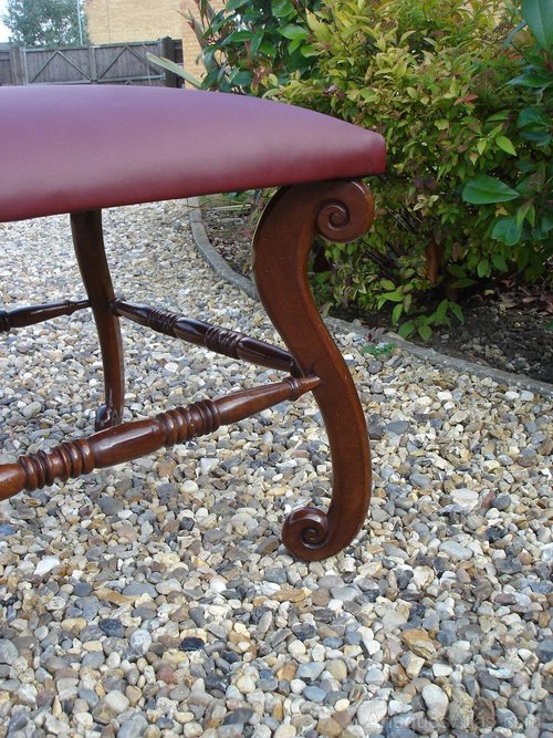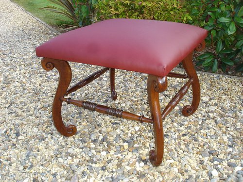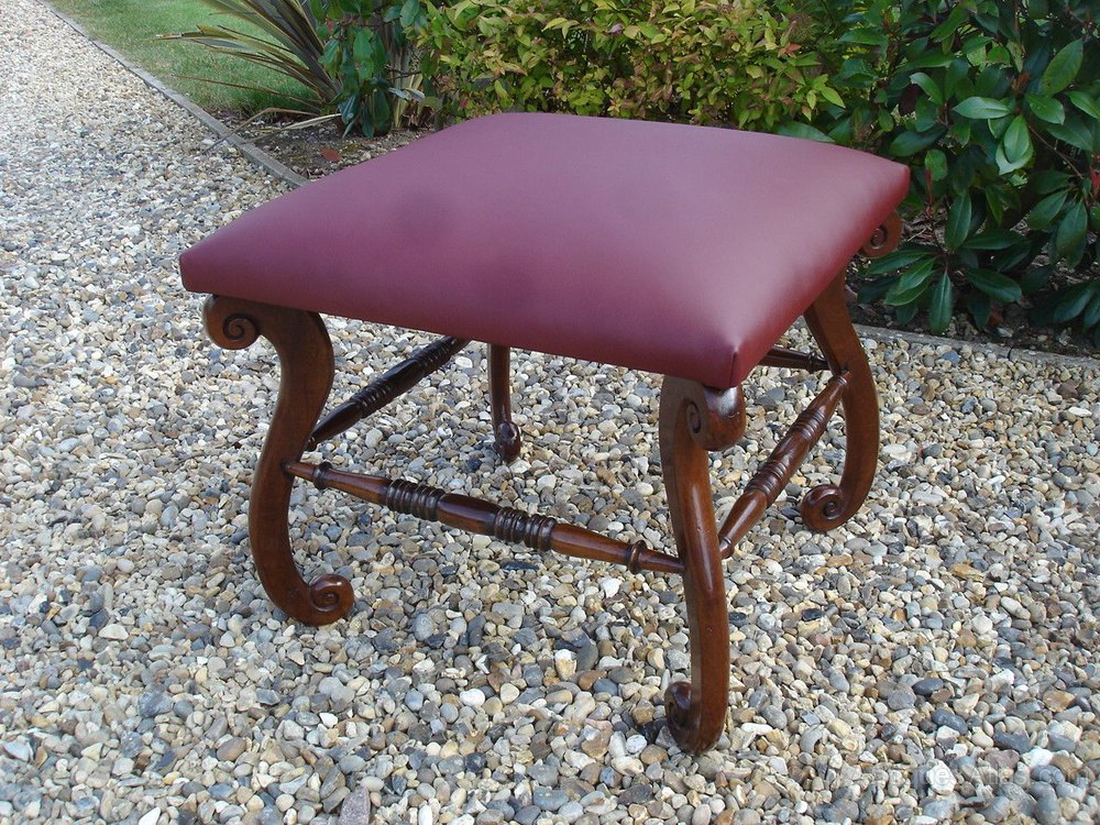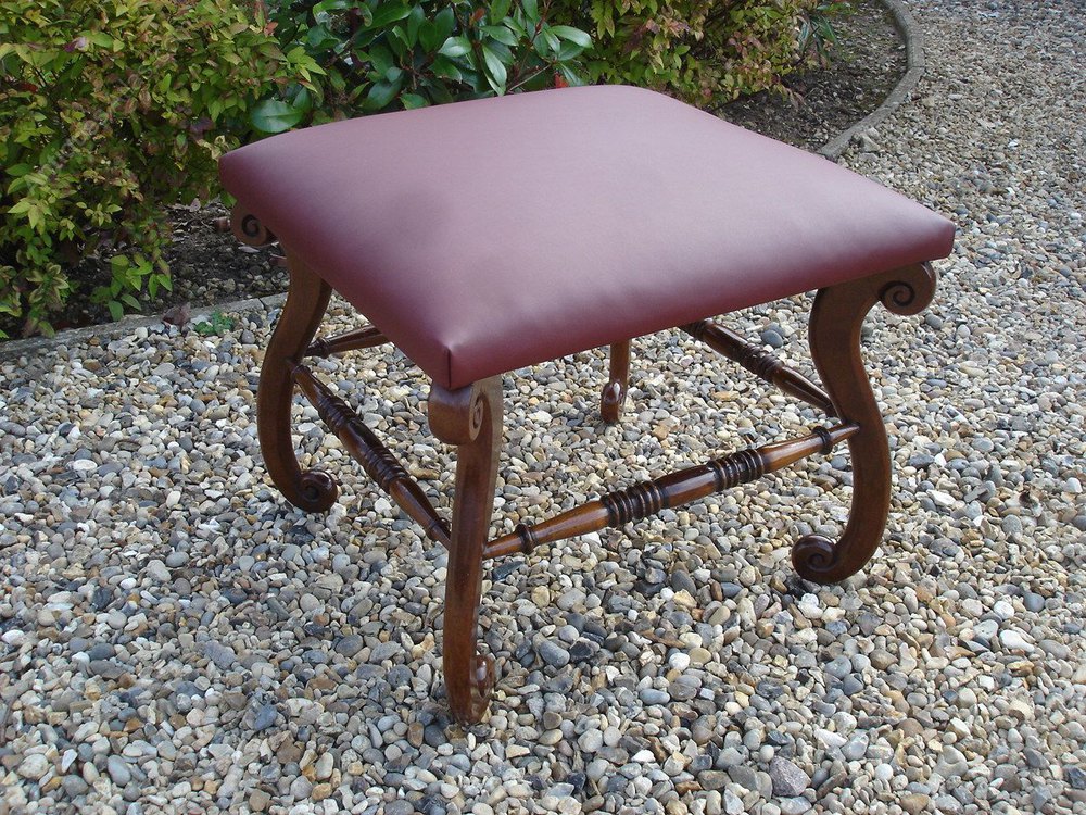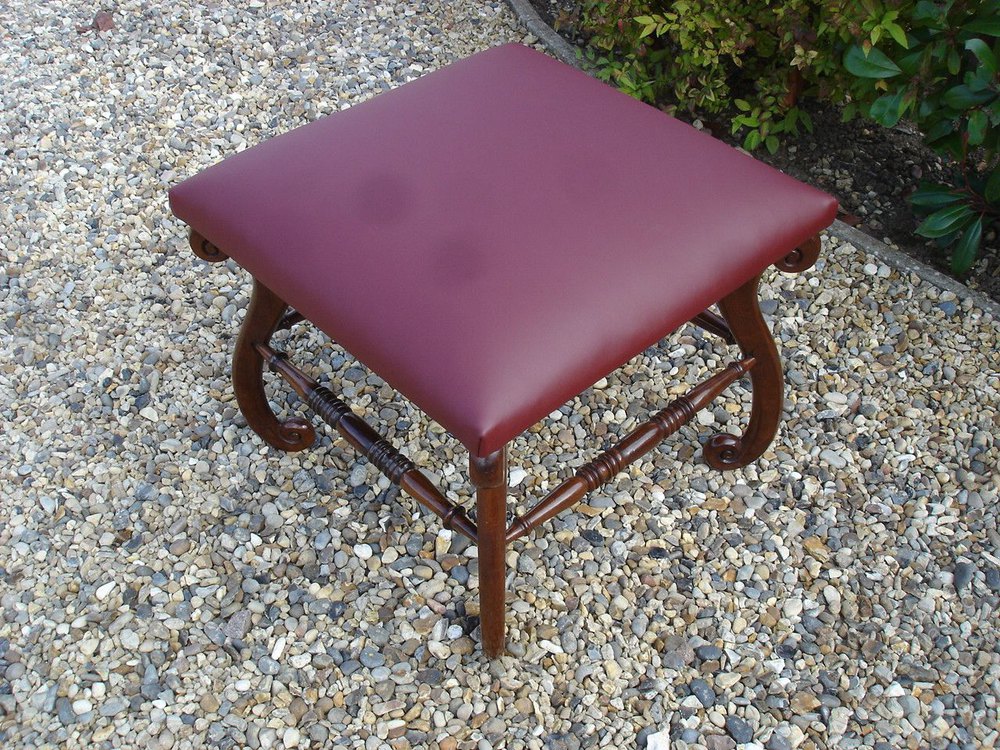 Victorian mahogany 's' legged stool. Fully restored to include full traditional upholstery, finished in Muirhead best hide.22" square H. 19"