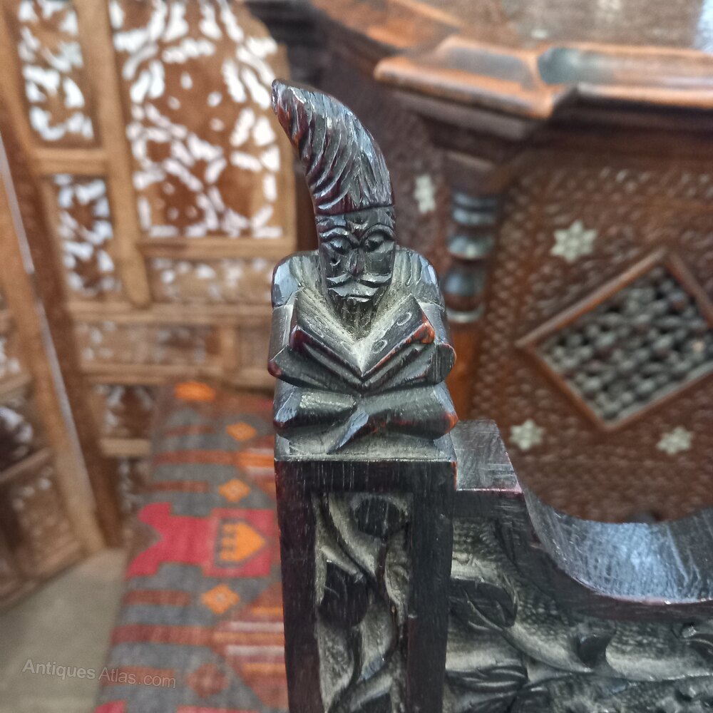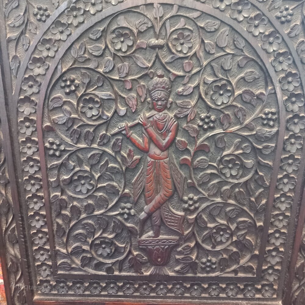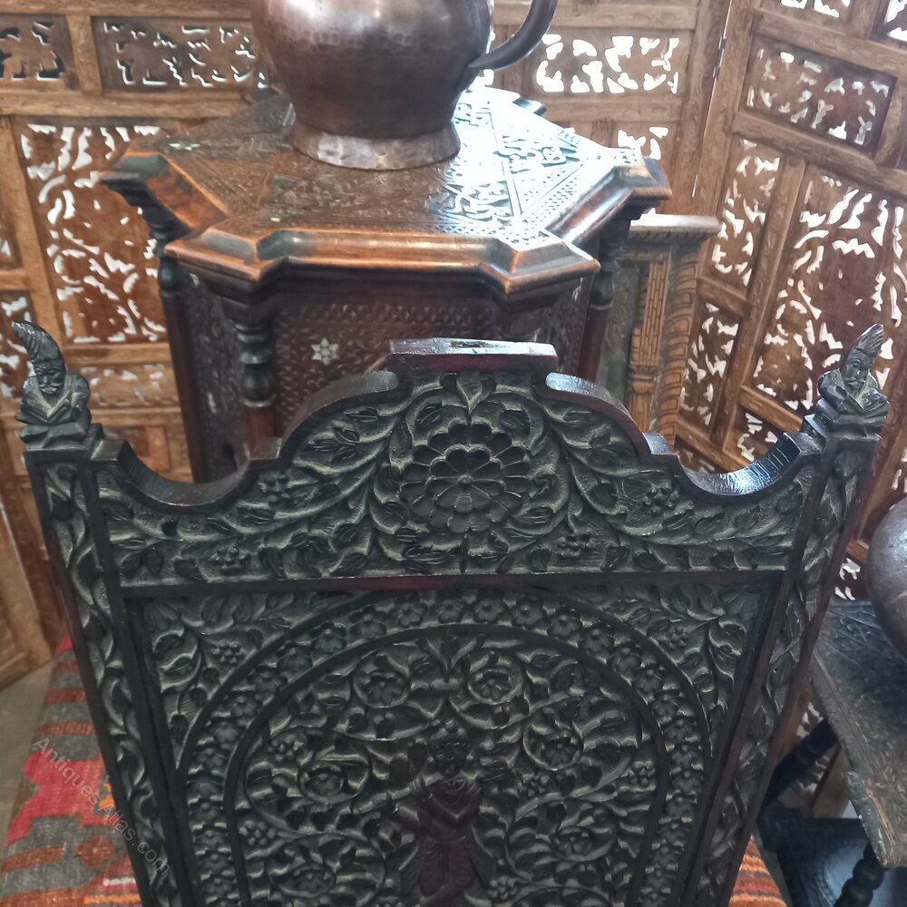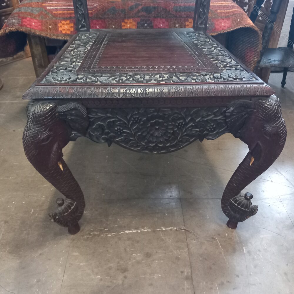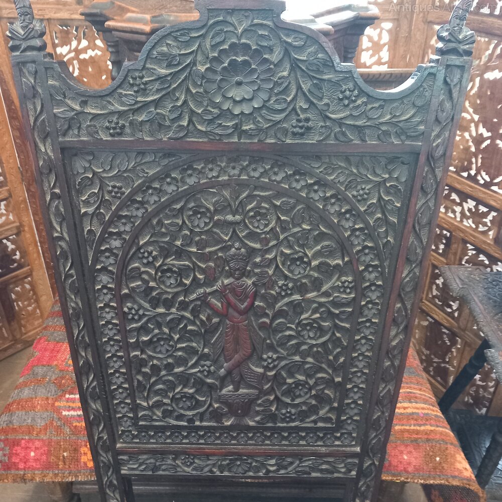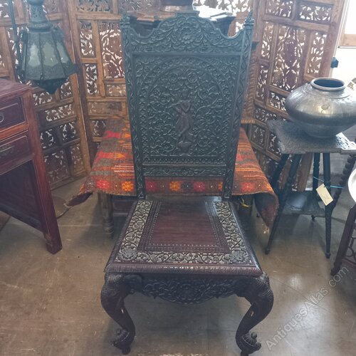 A very good Anglo Indian Padouk Wood Chair. Ornately carved all over with folage , the centre back panel carved with a Indian deity and two carvings either side of the top rail. Standing on very well carved Elephant legs There has been a small crest on the top rail which is missing but proportionately still looks fine and apart from that the chair is in excellent condition.Distance Selling Regulations
