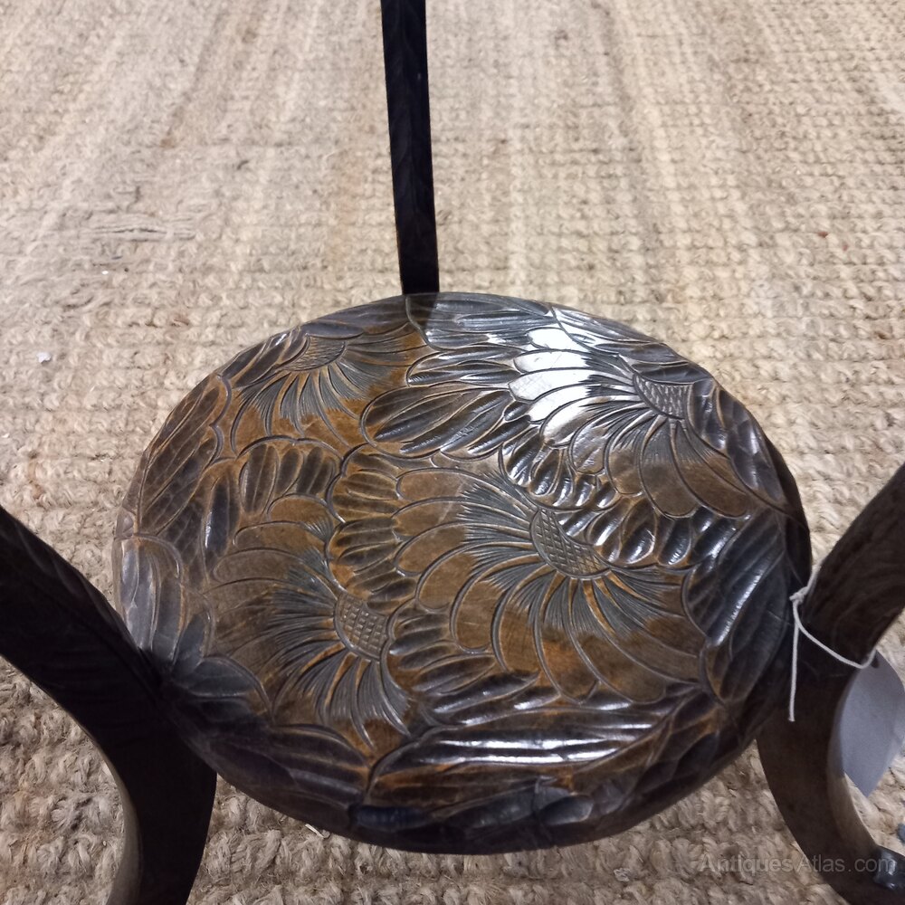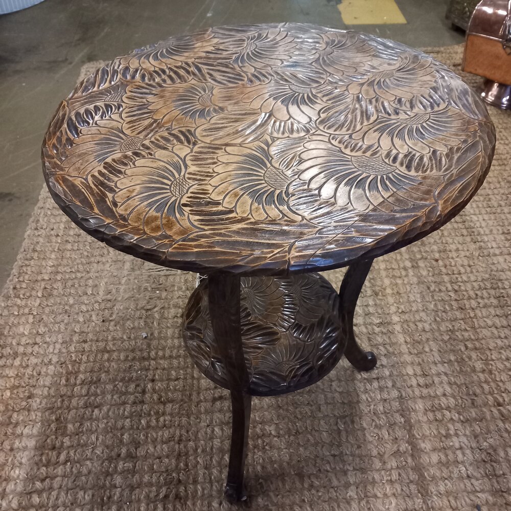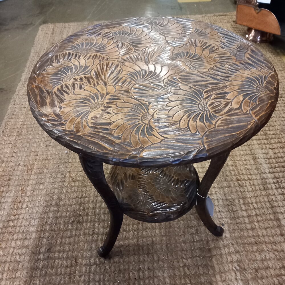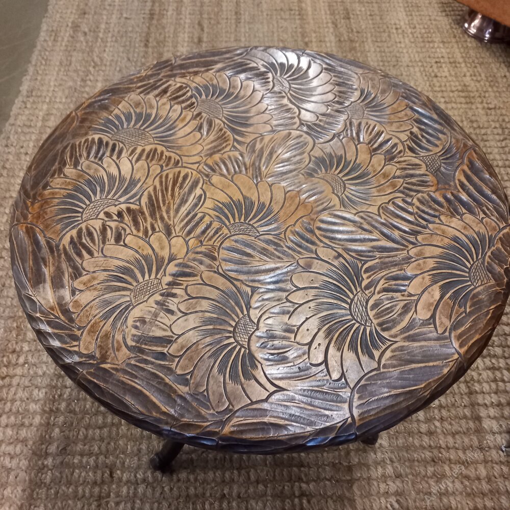 A good large Arts and Crafts occasional table originally retailed by Liberty of London, part of their of exotic range. The top is very well carved with cryshamthmum flowers and foliage.Distance Selling Regulations