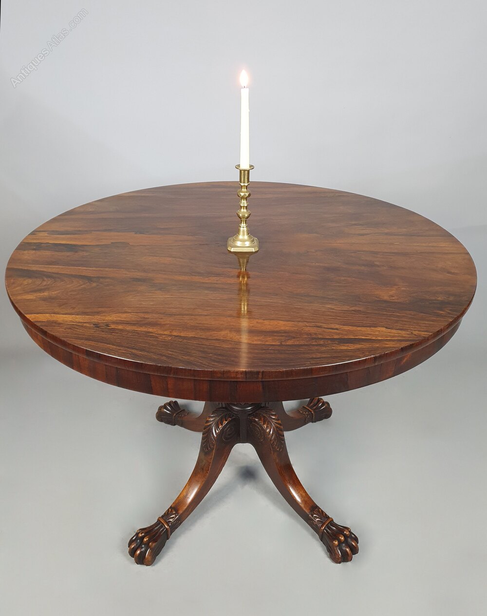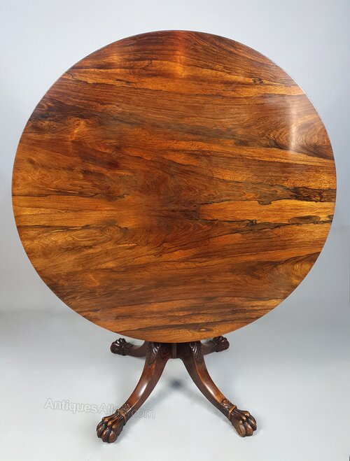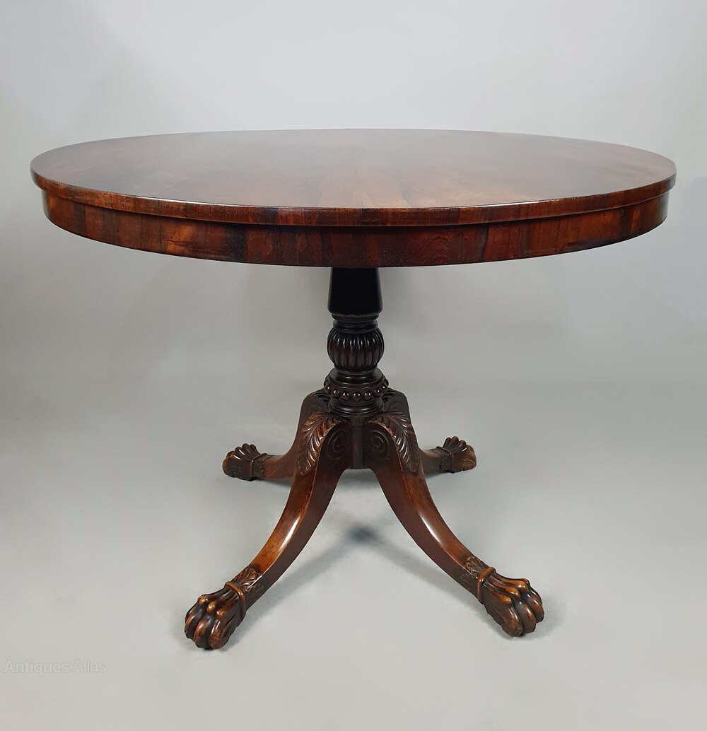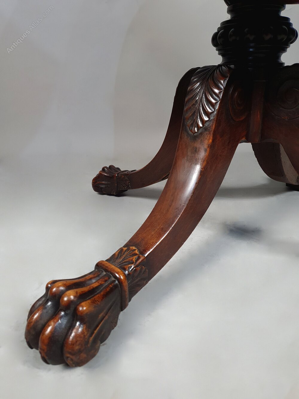 This table is made with the finest timbers and the column and legs are simply stunning – beautifully and fluidly carved with acanthus leaves and terminating in lion’s paw feet cuffed with bands and accentuated with acanthus leaves. The sides of the knees with carved scrolls, the column with multiple ring turns and a band of beading below a large fluted bulb.